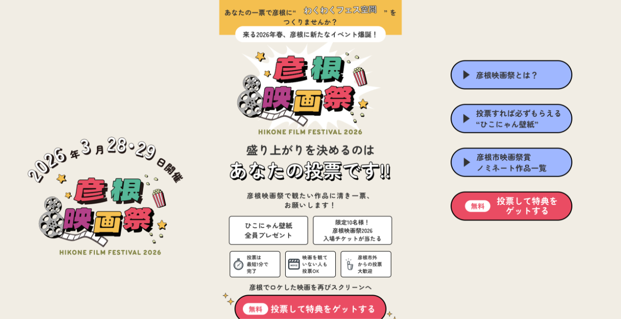 2026年3月28日・29日に開催予定の『彦根映画祭2026』を彩る『彦根市民映画賞』の投票案内ページを担当しました。ページ制作そのものだけでなく、ターゲット層の設定や特典の内容についても、提案させていただいています。