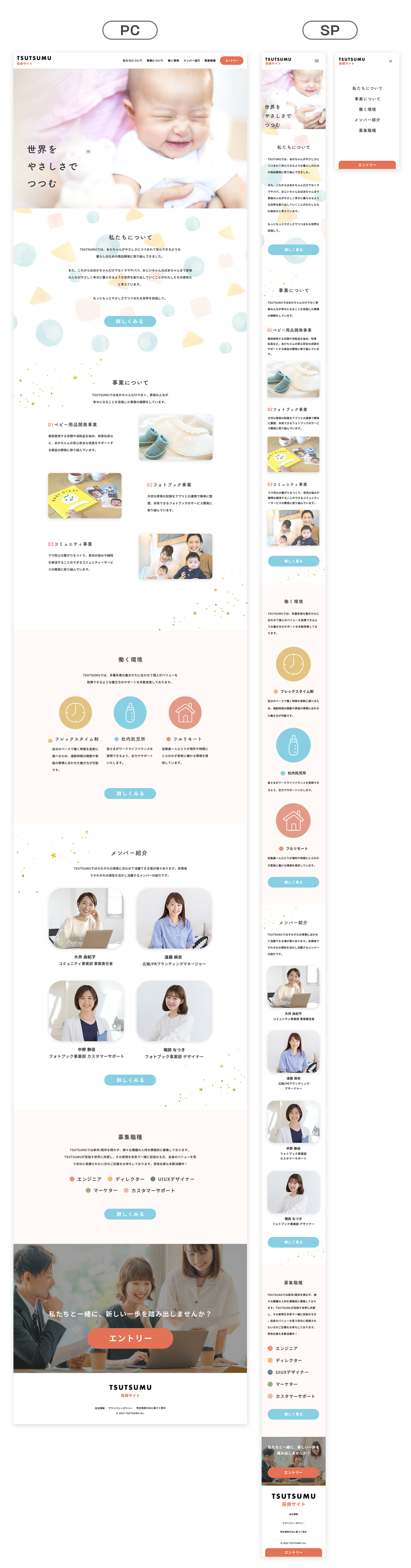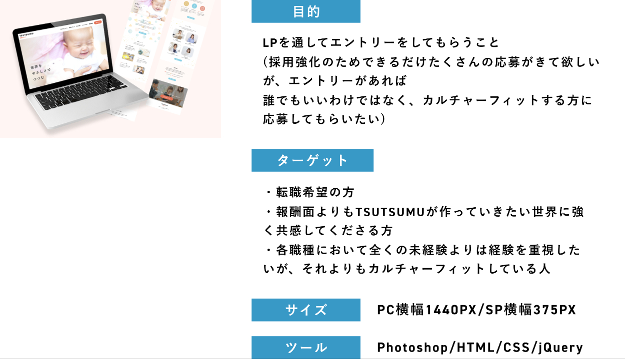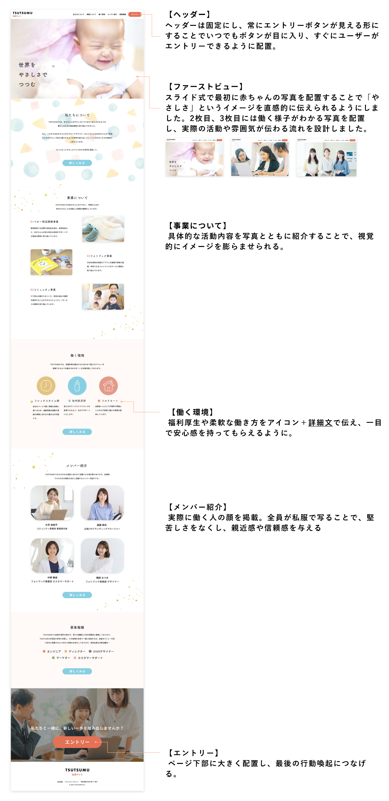 とても自由度が高く柔軟な働き方ができる会社だと思ったのでできるだけ堅苦しいイメージにならないように全体的に柔らかさや優しさを表現したデザインを制作しました。ふわっとした柔らかい表現を出すためにメインビジュアルの写真を加工したり、写真に影をつけたりし、職場の雰囲気もやさしさに包まれているとユーザーが感じてもらい、安心してエントリーしてもらえるLPを制作しました。