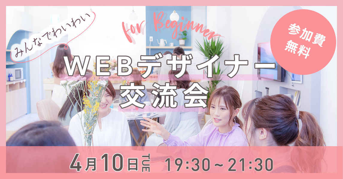 WEBデザイナー交流会の楽しさ、にぎやかさが伝わるようにピンクの色調の中でもオレンジがかった明るめ、濃いめの色調を使用し、初めて作成したバナーは下記デザインであったが、必要要素の「みんなでわいわい」が抜けていた点と、テキスト要素ごとのジャンプ率をもう少しつけること、バナーを見る方に伝えたい優先順位を整理して下記バナーに修正。