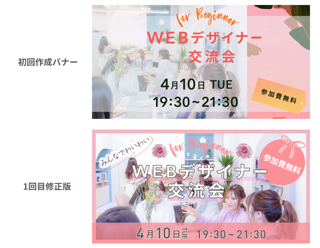 上記初回作成バナーの右側のサーモンピンクの背景は「交流会のイメージとは少し違うような印象」というフィードバックをコーチにもらい、全体の雰囲気と合ような背景に修正。