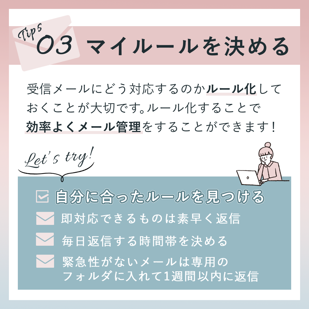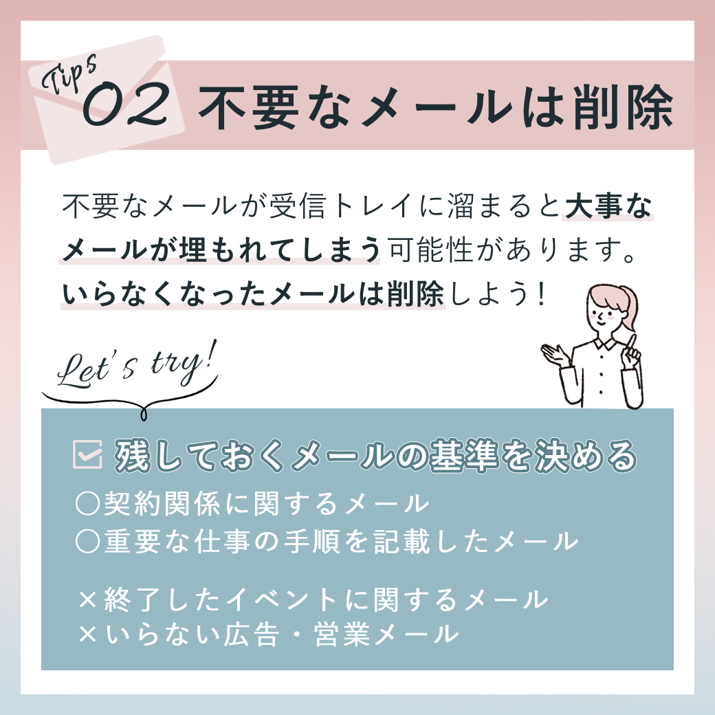 ・今回活用している女性のイラスト素材はテーマのメール管理に合わせて作業のイメージを持ってもらうことを意識しています。
