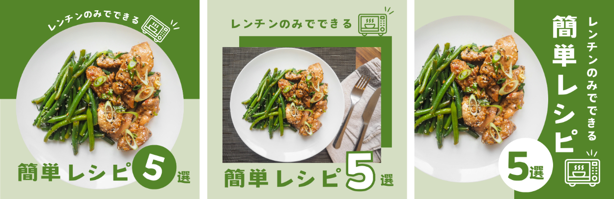 ・簡単レシピのワードを大きく配置し、さらに5つもレシピを紹介していることをアピールするため数字はよく目立つようにしました。