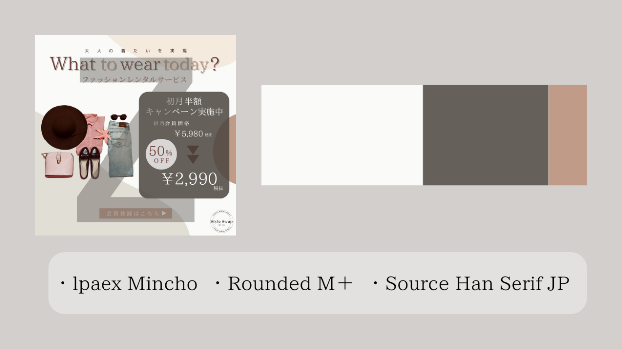 全体的にlpaex Minchoを使用しきれいめな印象に仕上げ、一部にRounded M+とSource Han Serif JPを使用しアクセントになるようにしました。