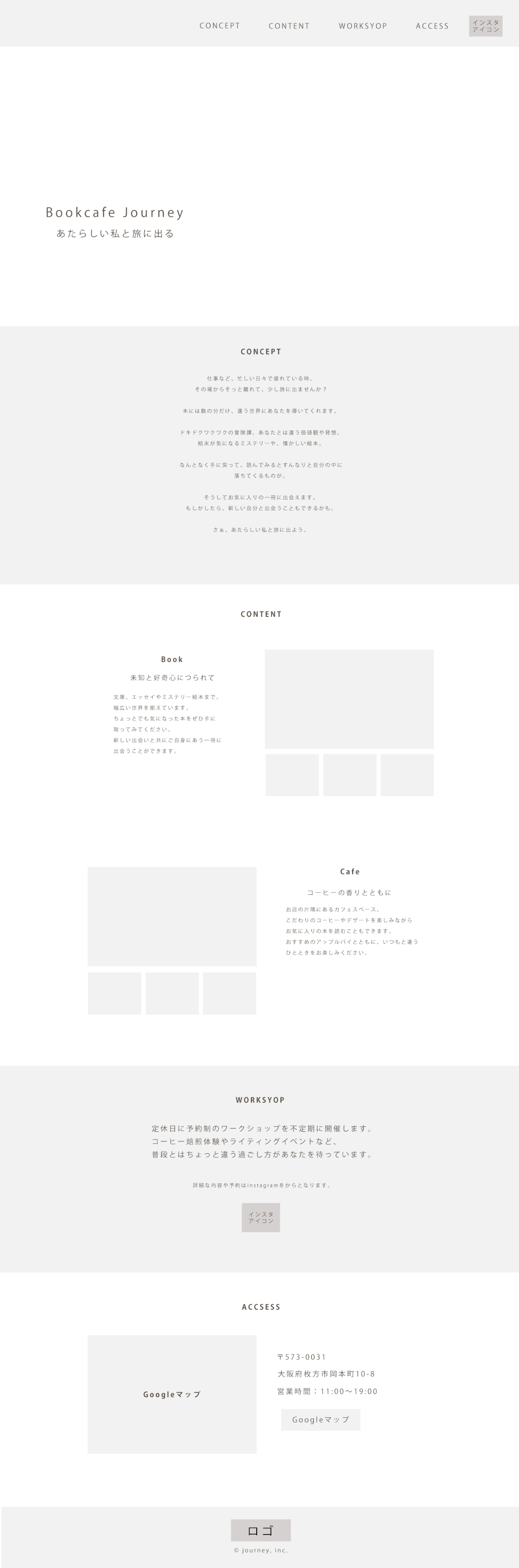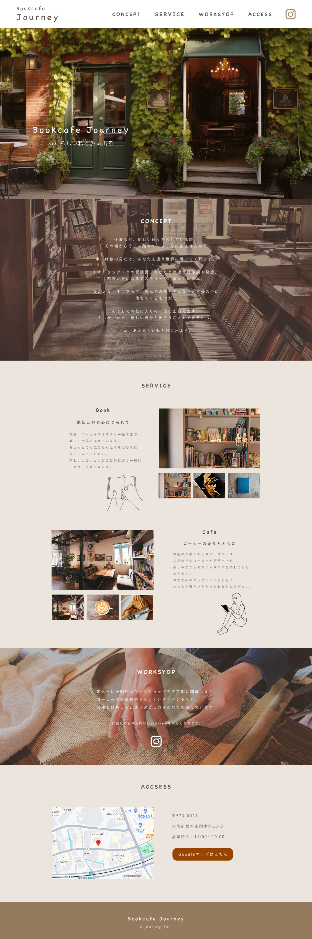 contents箇所では、本とカフェそれぞれの内容でJavaScriptのスライドで内容に合った複数の画像を目に入るように設計し、また落ち着いた隠れ家的雰囲気を出したかったので茶色やベージュに近いトーンに合わせて、こじんまりとしているけど暖かい雰囲気を表現しました。