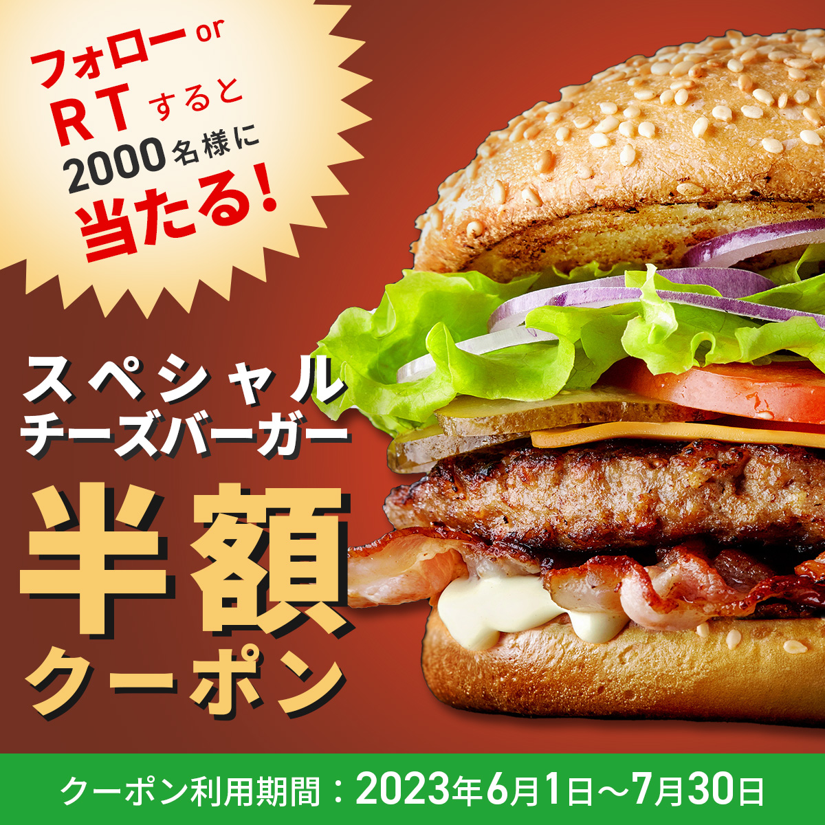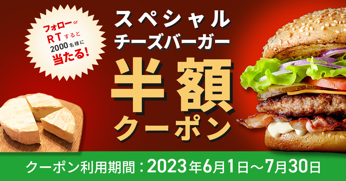 2000名様にスペシャルチーズバーガーの半額キャンペーンをします。