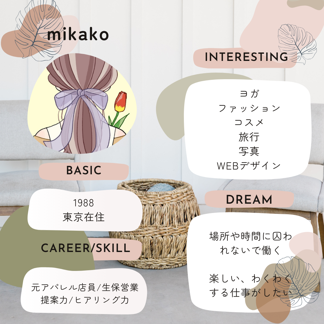 【自主制作】CANVAプロフィールカード mikako パソコン一台で仕事ができるを目指してる人 OVERVIEW SHE LikesのコミュニティイベントにてCANVAを使ってプロフィールカードを制作。 CANVA内のテンプレを使用し、自身の好みのデザインで制作。 YEAR 2023