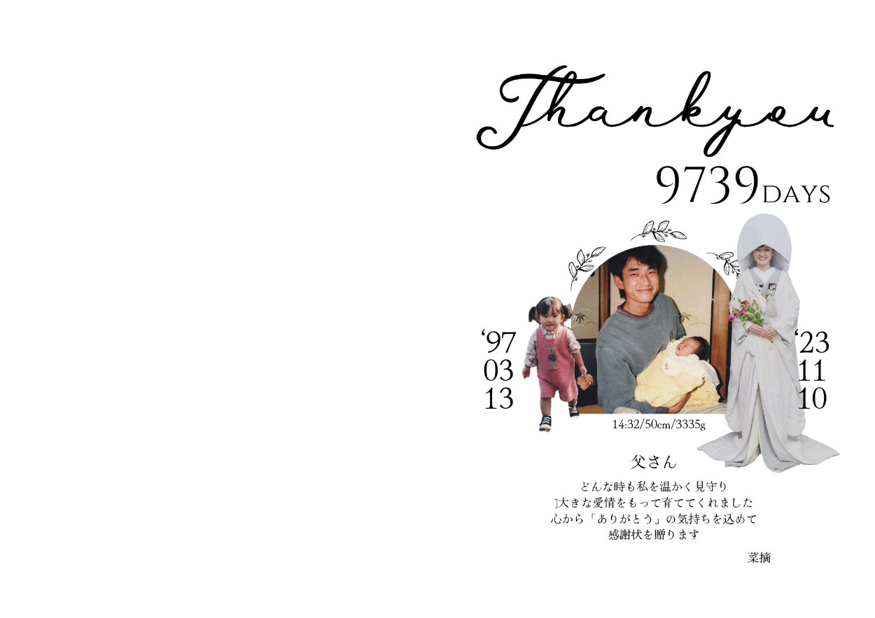 自身の結婚式で両親へ贈呈するために作成した子育て感謝状になります。