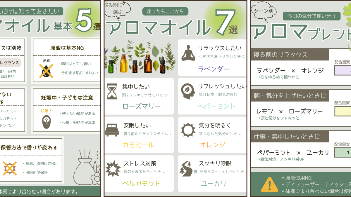 X図解 智愛(ともえ) スライド/図解デザイナー OVERVIEW アロマオイルは「なんとなく良さそう」で興味を持つ人が多く、初心者でも基礎や選び方を分かりやすく伝えられたらと思い制作しました。 【情報元コンテンツ】ChatGPT、Pinterest【制作のポイント】Xスクロール中、目に留まりやすいようタイトルを配置初心者でも身構えずに見られるように、やさしい印象を意識シリーズで、アロマオイル:基本・ブレンド・系統マップ・NG事項など制作しています。