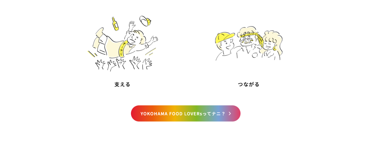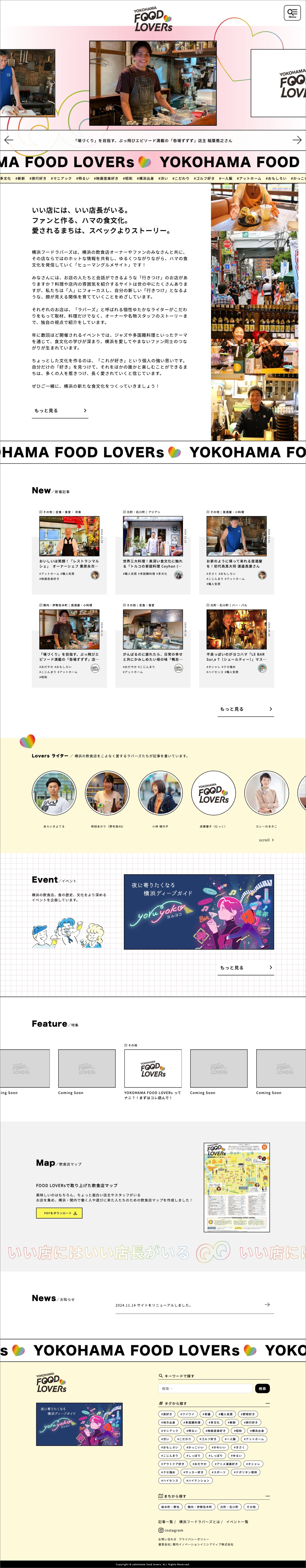 サイトのリニューアルのため、元々あった太字のロゴからデザインイメージを広げました。ロゴにある"目"や"ハート"のモチーフを細いグラデーションにして配置し、YOKOHAMA FOOD LOVERSの文字を左右に動かすアニメーションを採用してにぎやかな印象にしました。