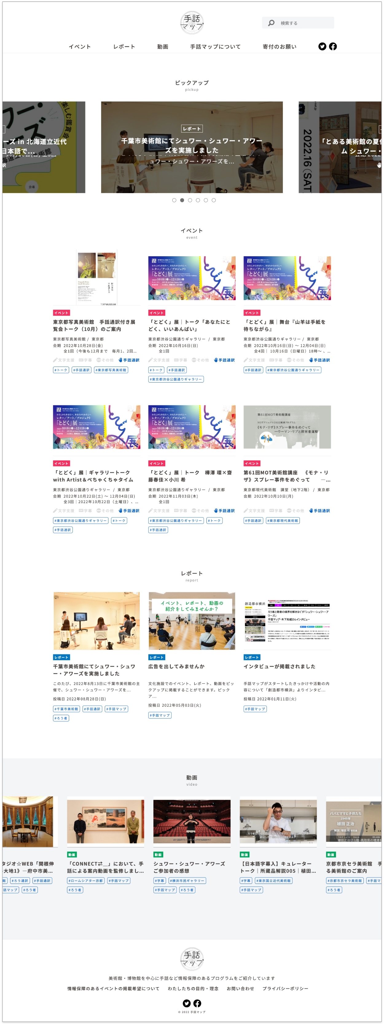「イベント(情報保障のプログラム紹介)」「レポート(プログラムに参加したレポート)」「動画(美術館・博物館にて行われた聴覚障害者向けの手話解説)」と3つのコンテンツをトップページに集約し、メニューやタグなどで絞り込みしやすいよう工夫しました。