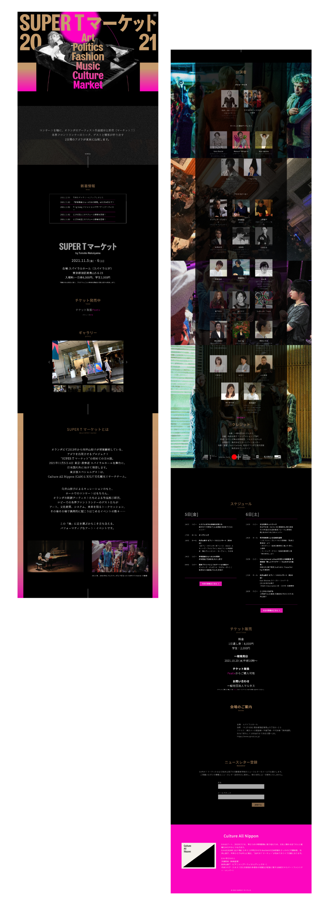 「SUPER T マーケット」という2日間開催される有料イベントのサイトで、チケットが販売開始のティザーサイト・販売中のサイト・販売後のページ更新を行いました。