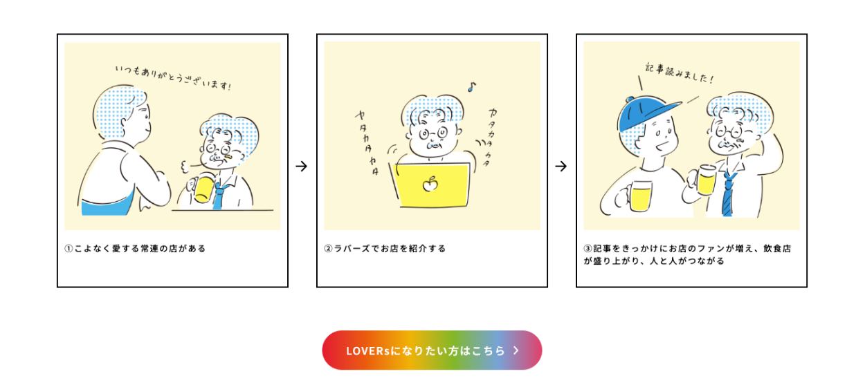 記事を書くのが飲食店の常連さんということから、コミカルで楽しげな常連さんのイラストを描きました。