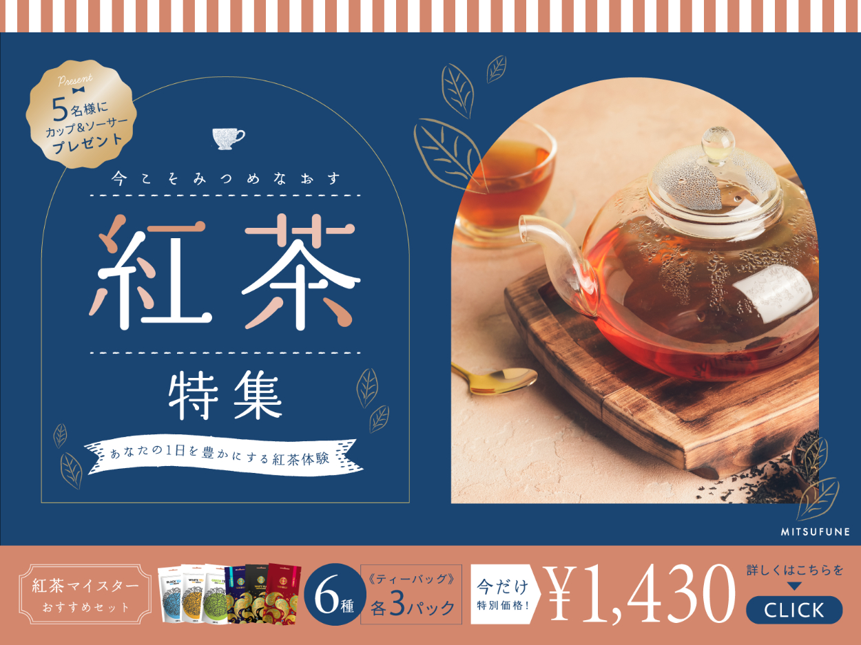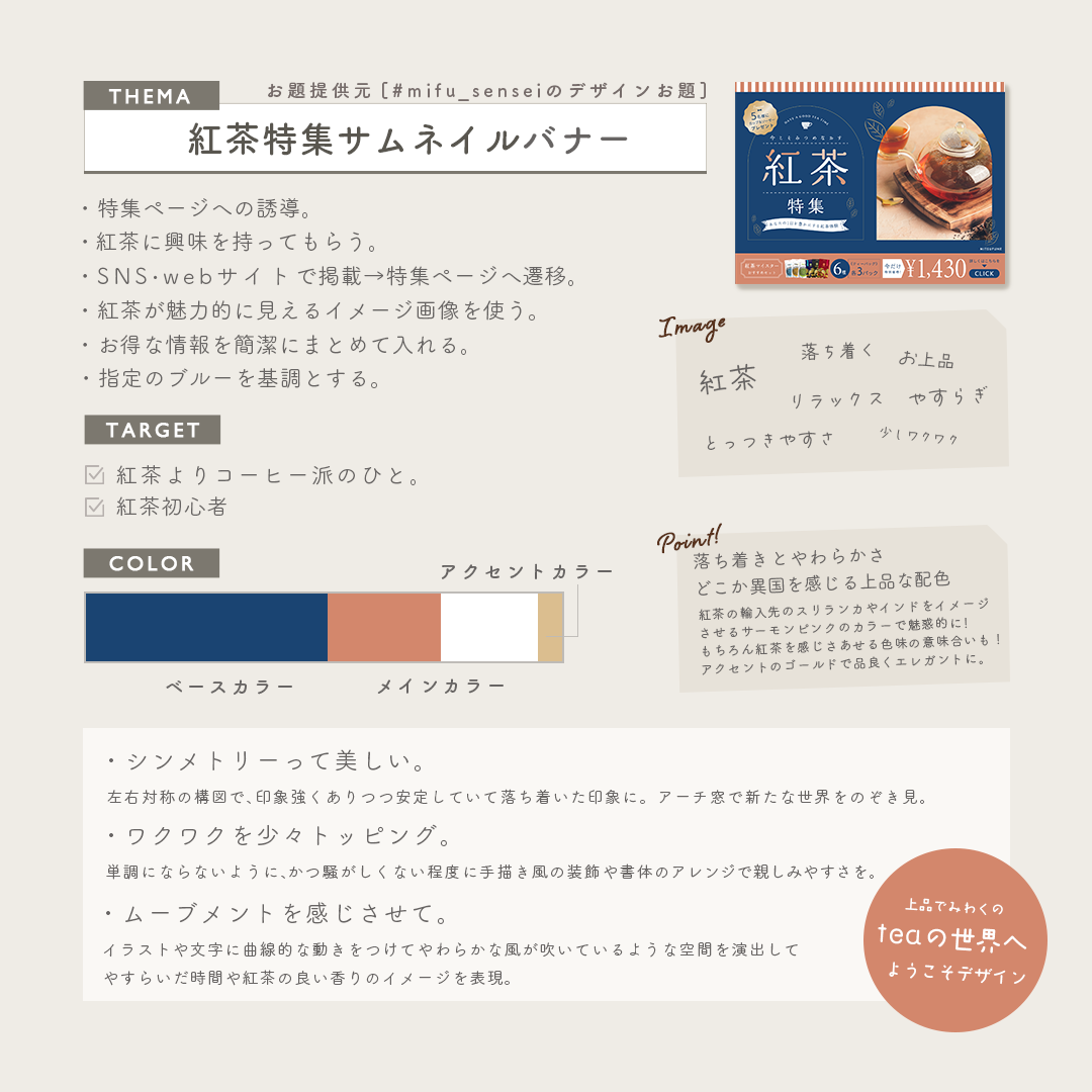 【自主制作】紅茶特集サムネイルバナー KEIKO UEDA デザイナー/イラストレーター OVERVIEW 2024.6.9/制作時間:5時間/使用ツール:Illustrator/コンセプト:新しい扉を開く。異国情緒あふれる上品なデザイン。 YEAR 2024
