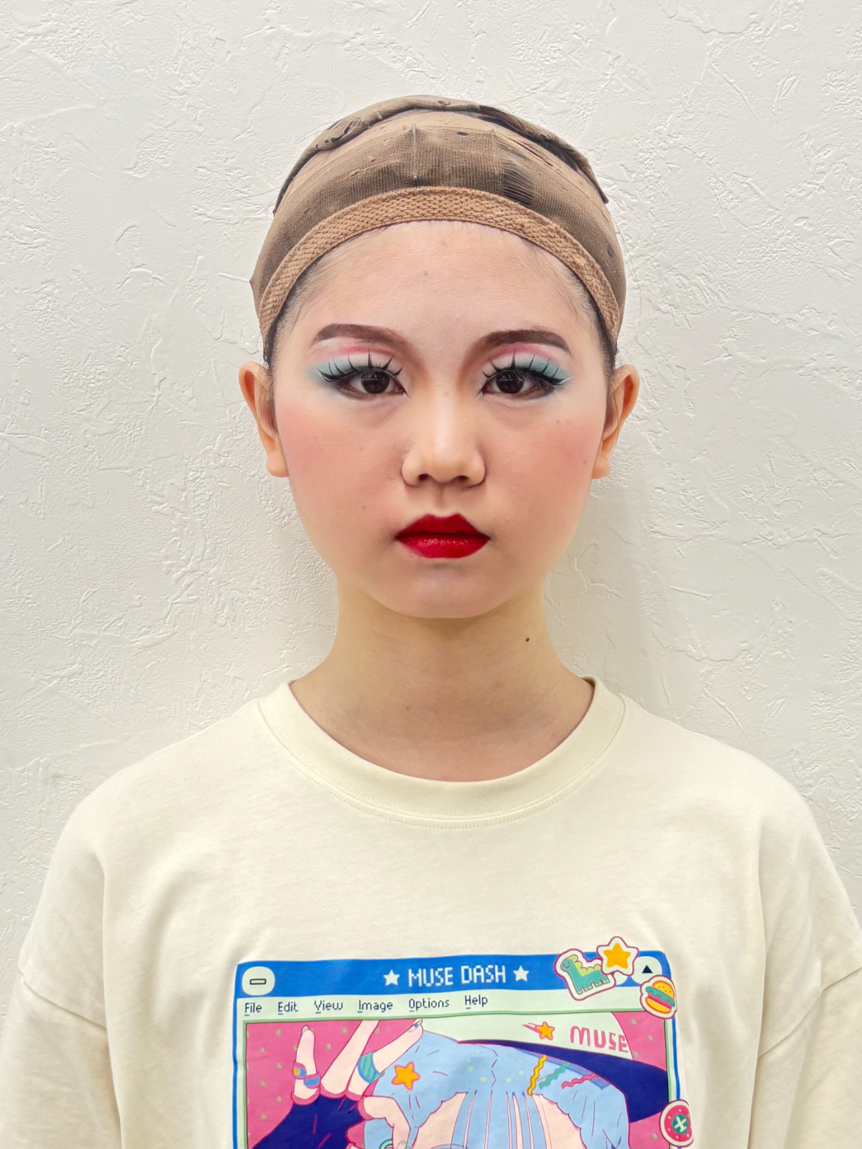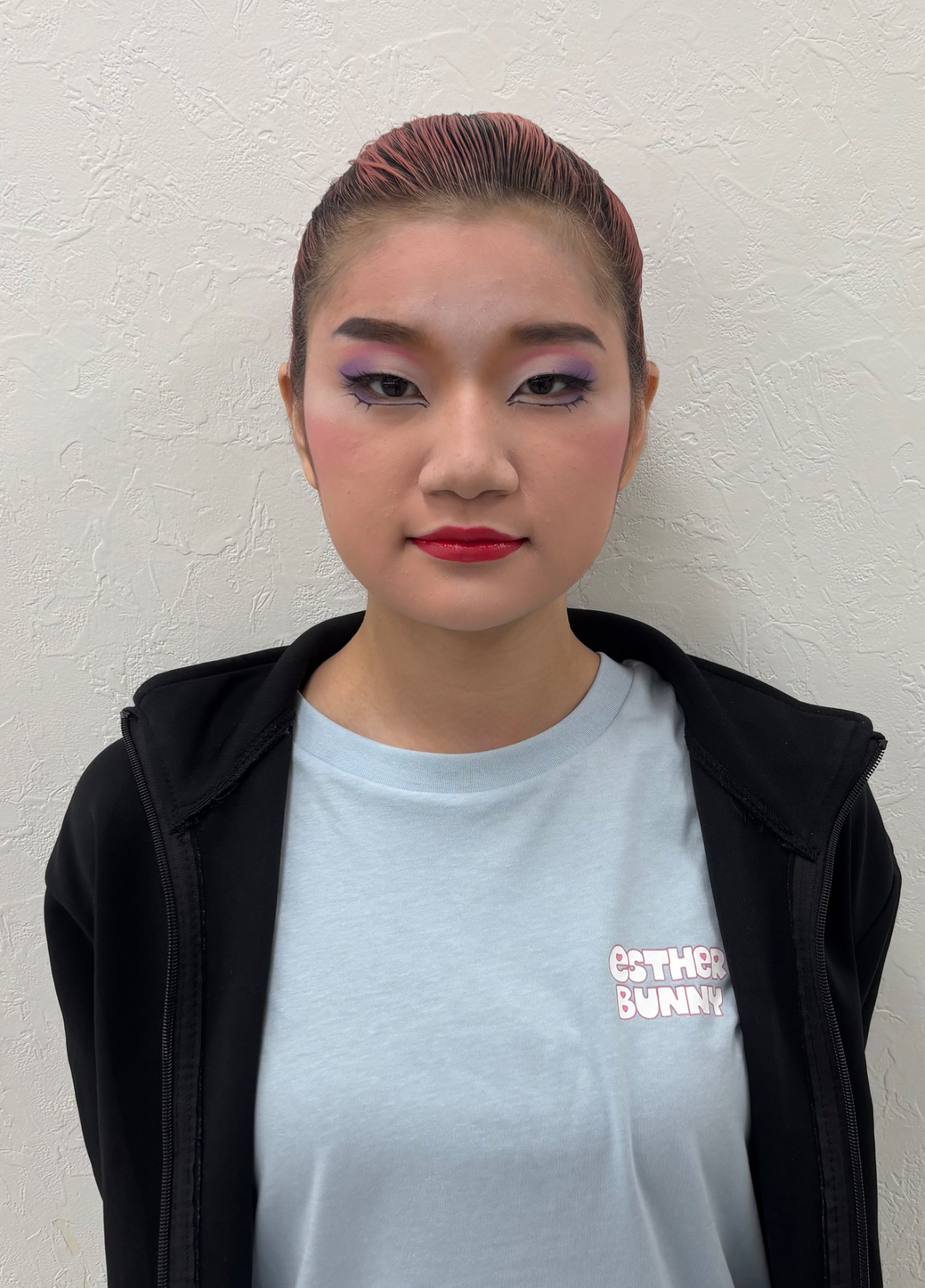 照明下でも表情がはっきり伝わるよう、コントラストを強めに、アイカラーを乗せるのを意識しました。