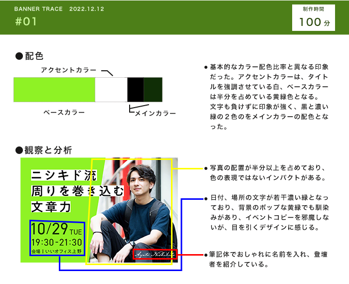 全体の半分を写真が占め、文字数が少なく、情報量が完結でも伝わるバナーがあることを学びました。アピールする人やモノ次第では、多くの文字情報がなくても、むしろシンプルな方が目を引くことを理解しました。