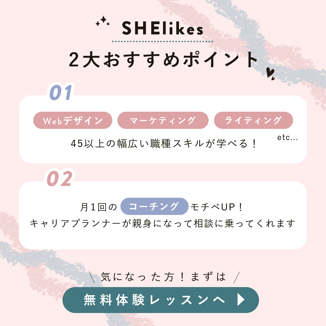 テーマ「SHElikes2大おすすめポイント」のバナーを制作しコンペで採用されました。