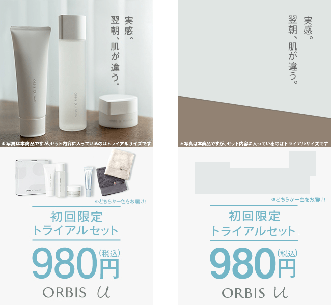 「※どちらか一色をお届け!」の上のトライアルセットの画像と上部の大きな写真との距離がほとんどないが、背景色と近いからか意外と気にならない。制作時、写真を省いてしまったが、商品と背景色が似た色の場合も影をつけることで、目立たせてある。自分なら商品を目立たせるために濃い色を背景に置いてしまいそうなところだが、商品イメージを崩さずに淡い色でまとめたい場合は影をつけるのは有効な方法だと思った。改めて見てみると、価格の部分のフォント少し太くなるだけでスマートさが無くなってしまったので、この場合は文字の形よりも太さを優先した方が良かったように思う。