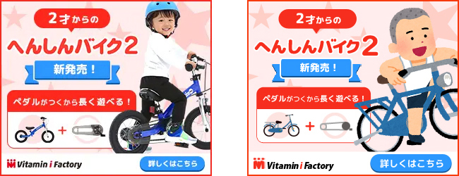 「新発売!」のリボンはドロップシャドウ、「へんしんバイク2」の文字は境界線の効果を使用。男の子のイラスト、自転車のイラストはいらすとやさんより。