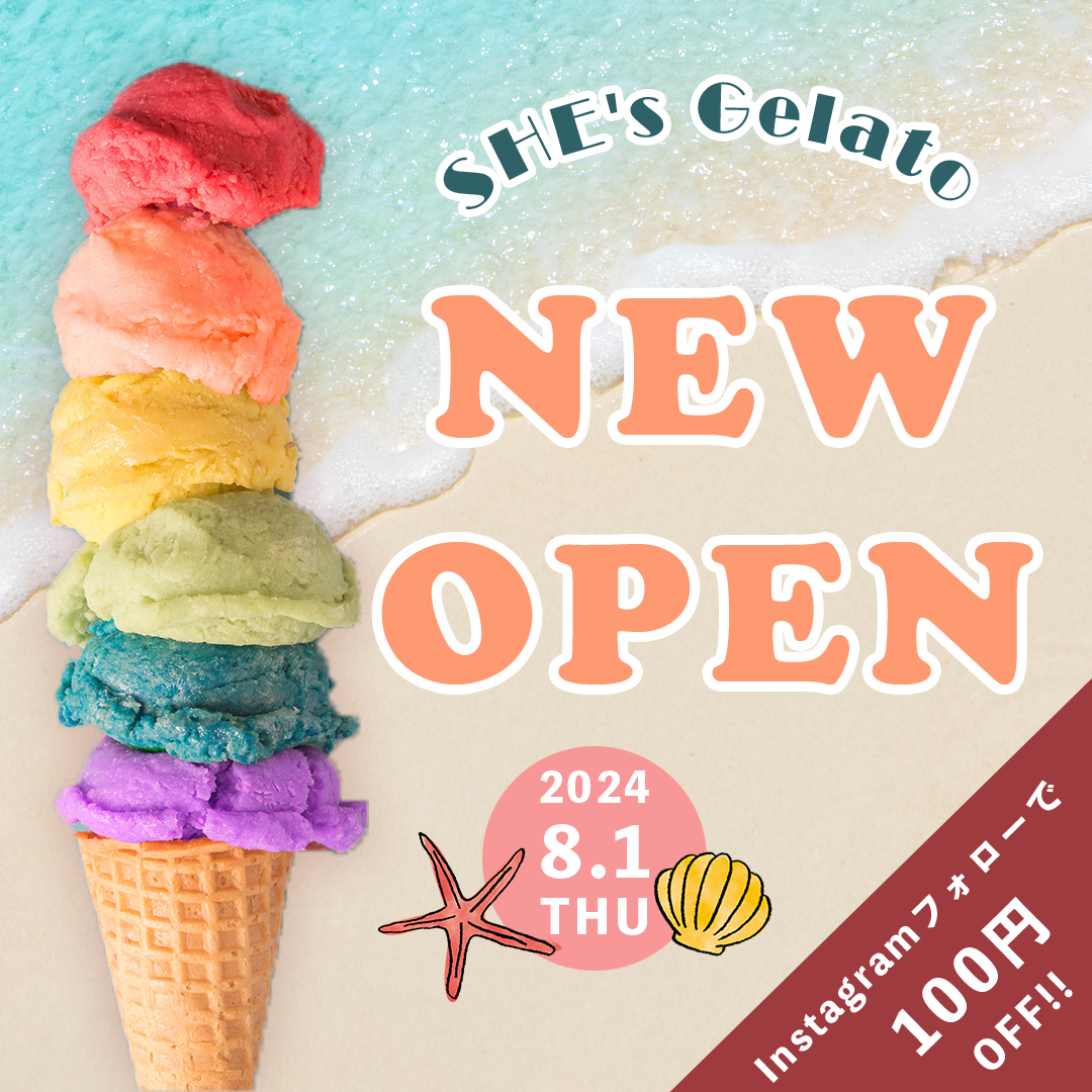 店舗名「SHE's Gelato」や「NEW OPEN」「Instagramフォローで100円OFF」といった重要情報をわかりやすく配置し、視認性を高めています。