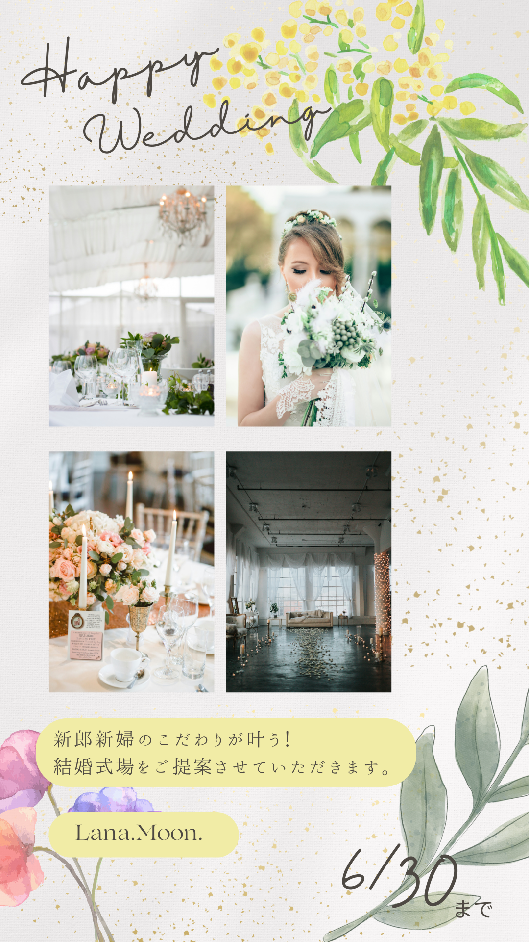 ・「Happy Wedding」と「6/30」のフォントを手書き風にすることで親しみやすい雰囲気を出しました。