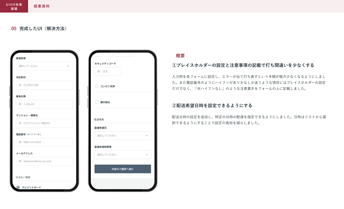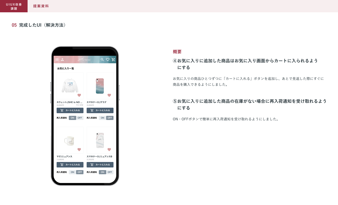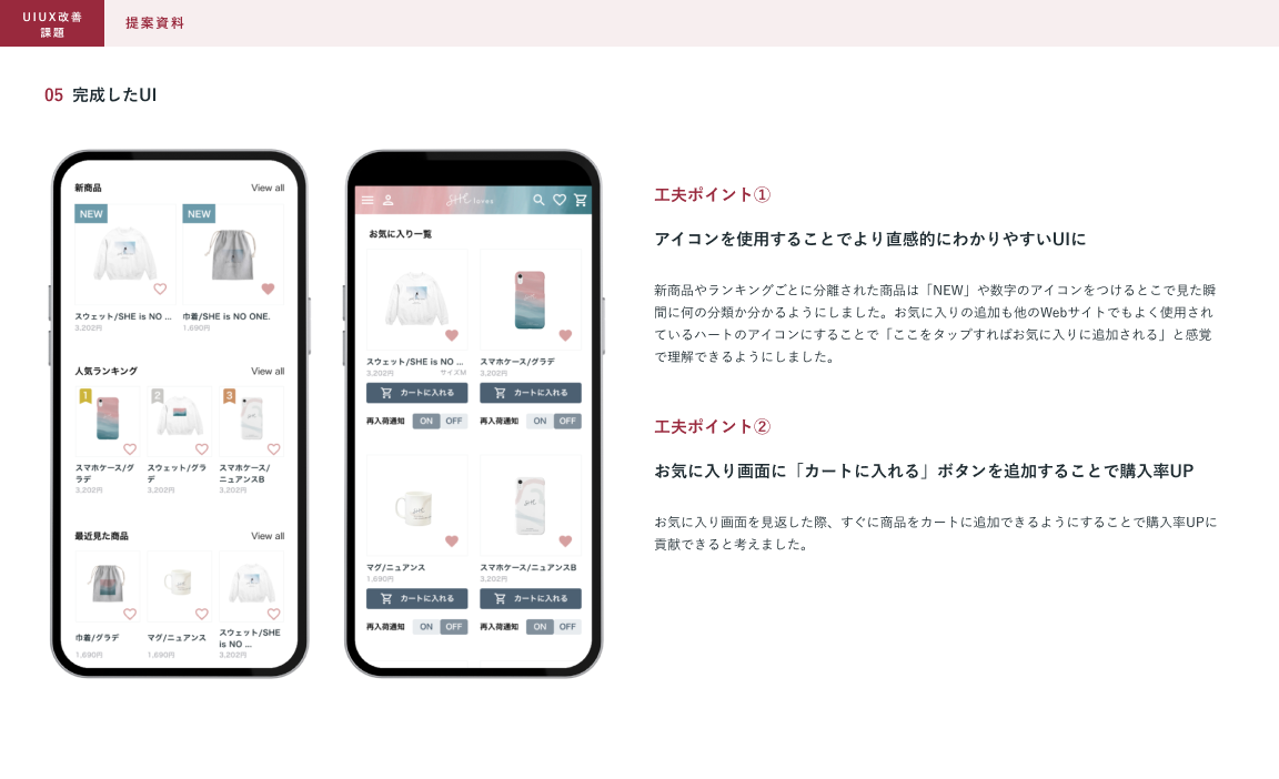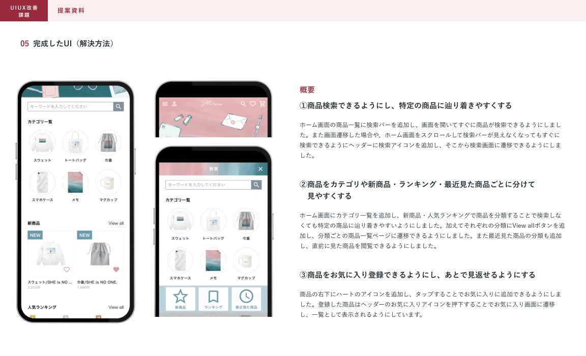 SHElikes PRO Designerの課題にて、ECサイトのUI/UX改善提案課題に取り組みました。クライアントから頂いたデザインデータをもとに3つの課題のうち2つの課題に対して改善案を作成しました。