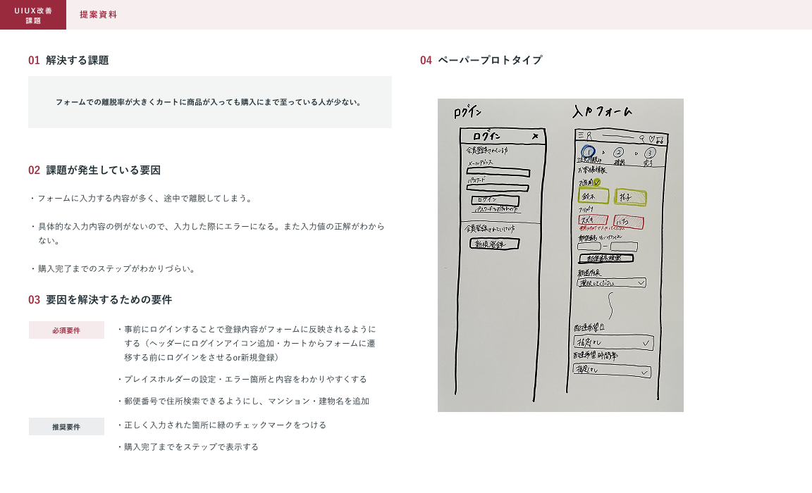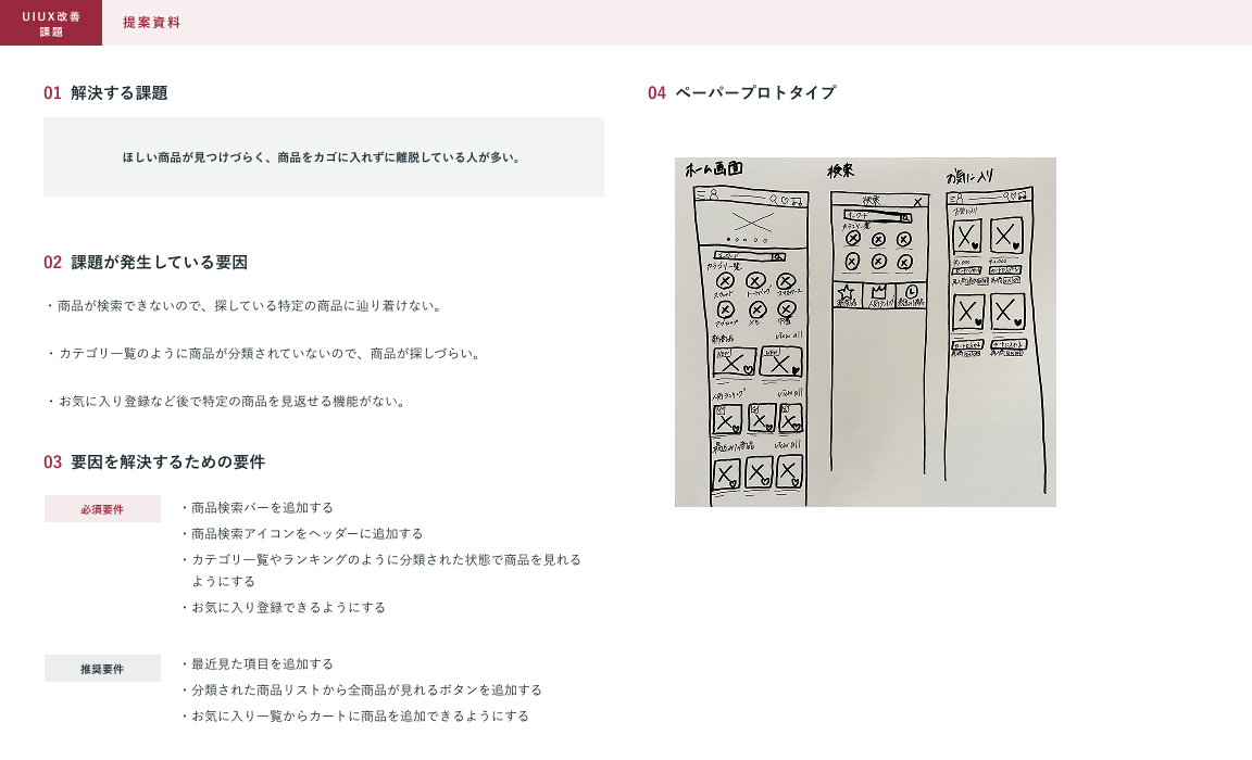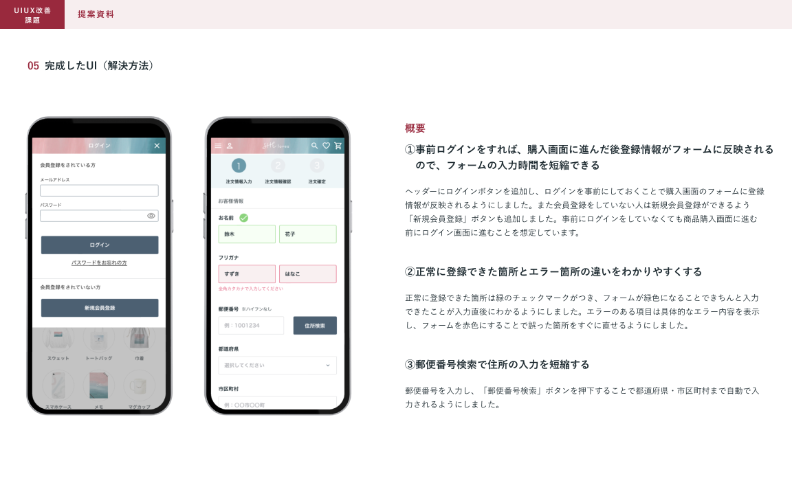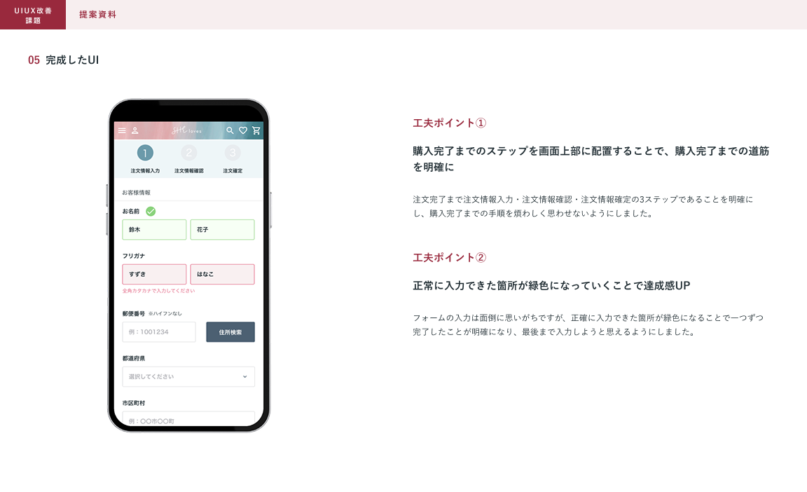 SHElikes PRO Designerの課題にて、ECサイトのUI/UX改善提案課題に取り組みました。クライアントから頂いたデザインデータをもとに3つの課題のうち2つの課題に対して改善案を作成しました。