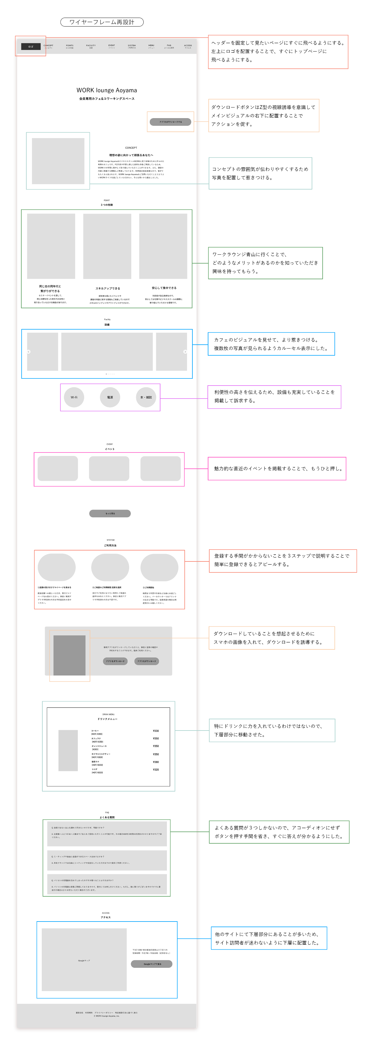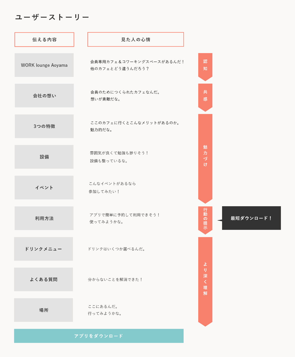 ユーザーが何を求めているのか、どのような心の動きがあるのかユーザーストーリを作成して検討することで、ワイヤーフレームの情報設計の際に優先順位をつけて配置しやすくなることが分かりました。