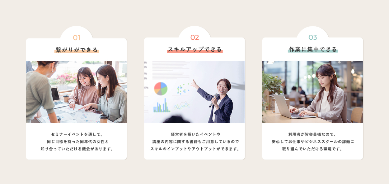女性向けのビジネススクールを展開している。 会員は20~30代の女性が多く、 キャリアアップのためにビジネススキルを学び、 さらにそのアウトプットの場として定期的にビジネスコンテストなどのイベントも開催されている。
