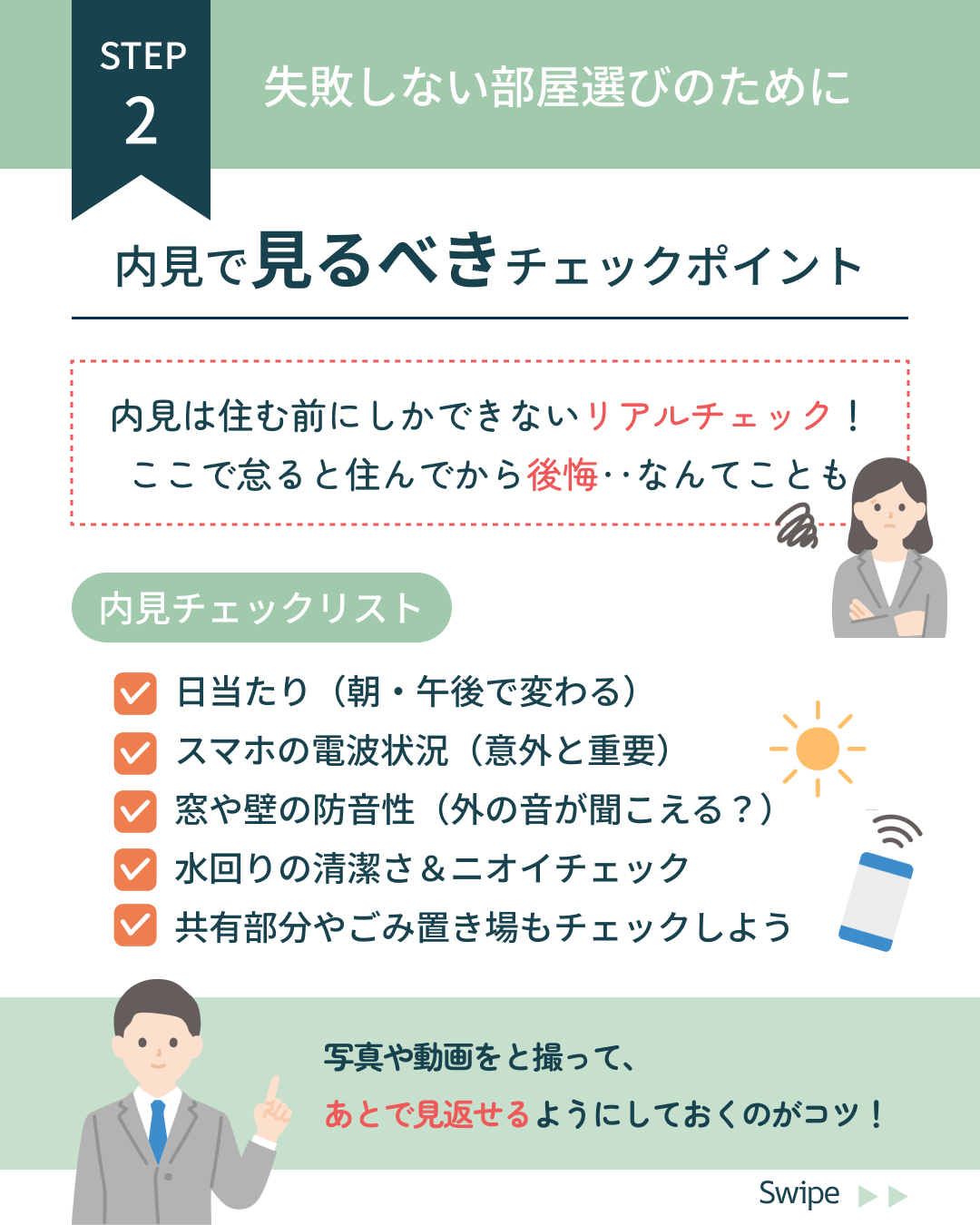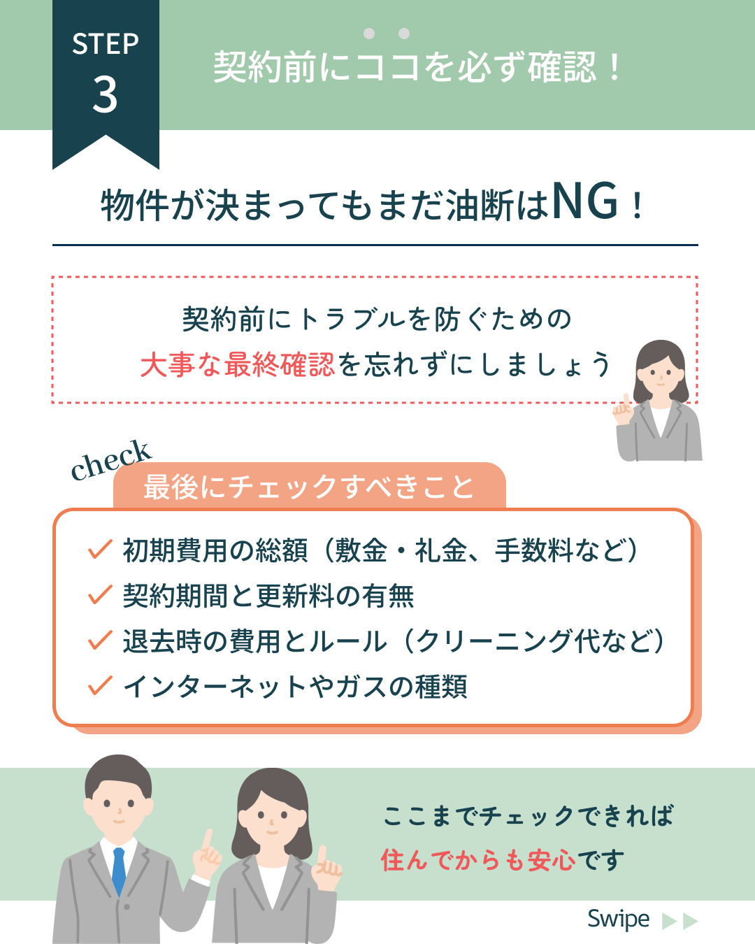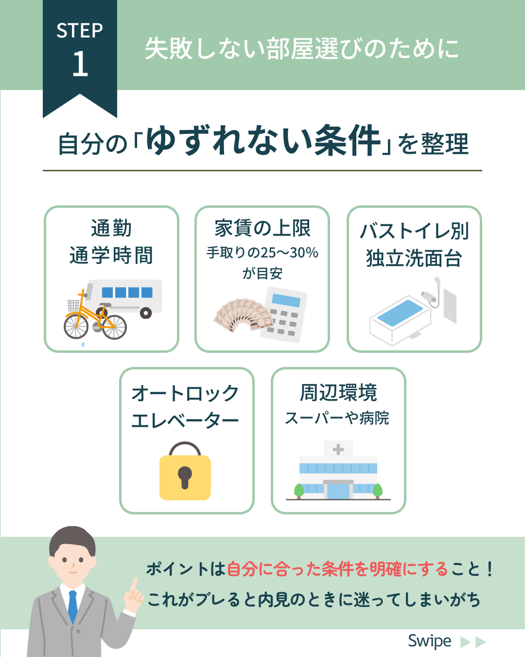 初めての一人暮らしで賃貸を探す20代前半の男女向けに、賃貸物件を扱う不動産会社のInstagram運用として、賃貸選びのポイントを解説したフィード投稿を想定して制作しました。※自主制作