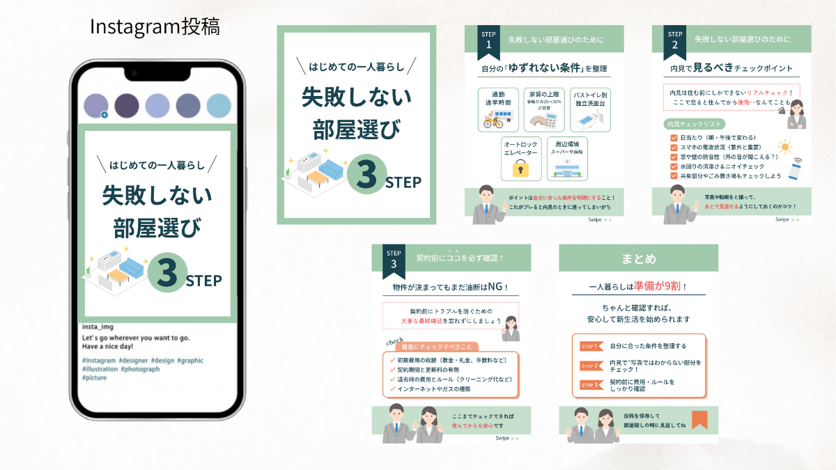 初めての一人暮らしで賃貸を探す20代前半の男女向けに、賃貸物件を扱う不動産会社のInstagram運用として、賃貸選びのポイントを解説したフィード投稿を想定して制作しました。※自主製作