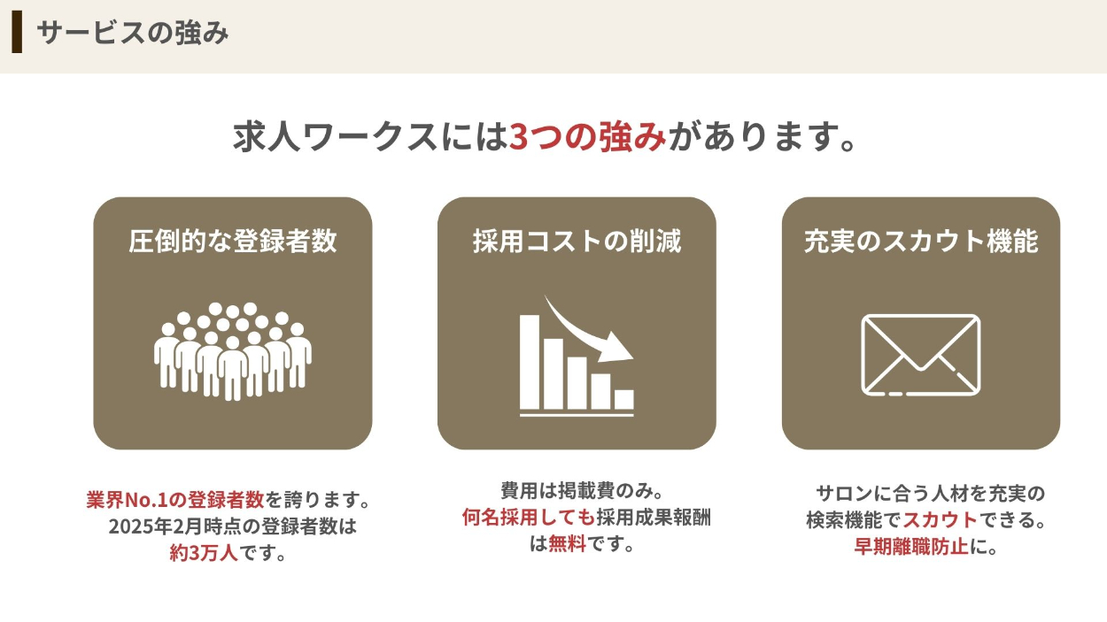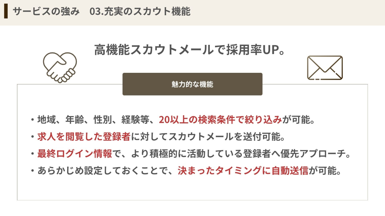 ・何が強みなのか、本当に採用できるのか、採用できるための仕組みにはどんなものがあるか…企業側が知りたいと思っている情報を漏れなく載せています。