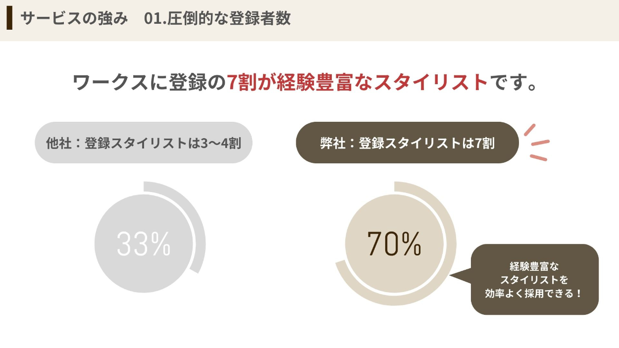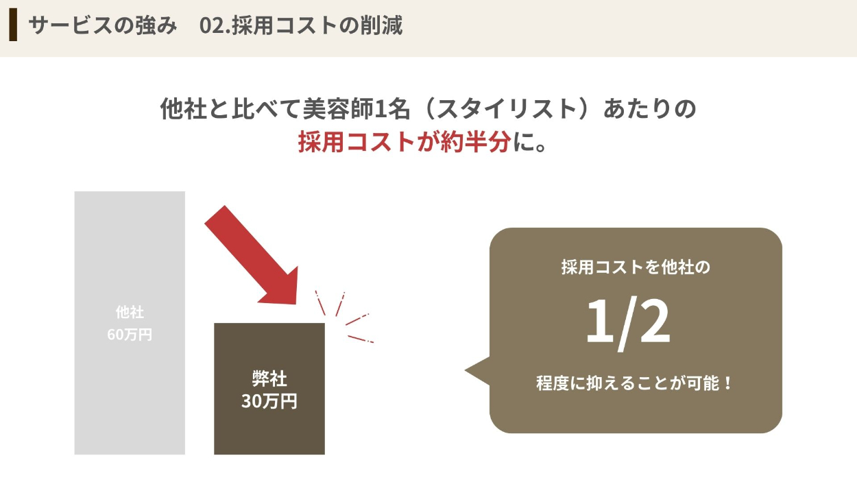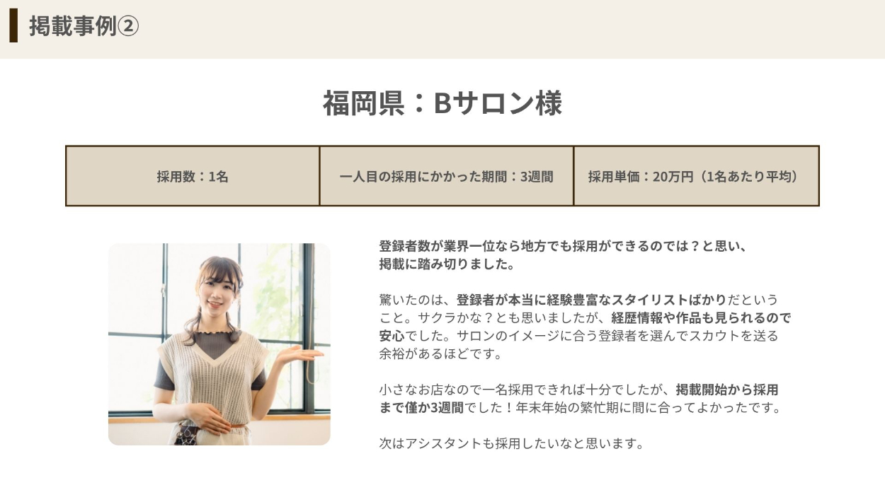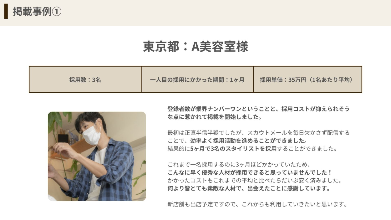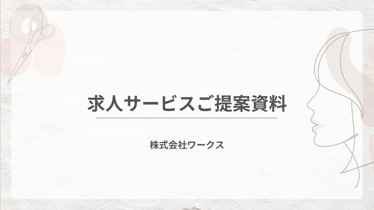 求人広告を運営している企業の営業用資料(求人サービス紹介資料)を作成しました。『美容師の採用に向けたサービス』をテーマに、デザインを行いました。 ※自主制作※