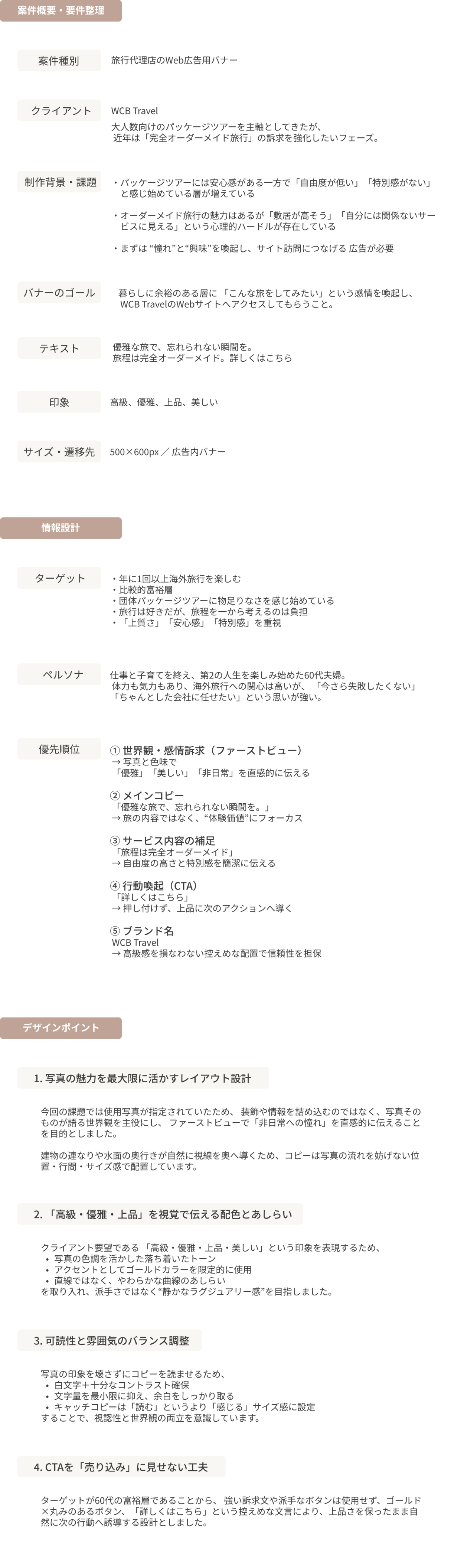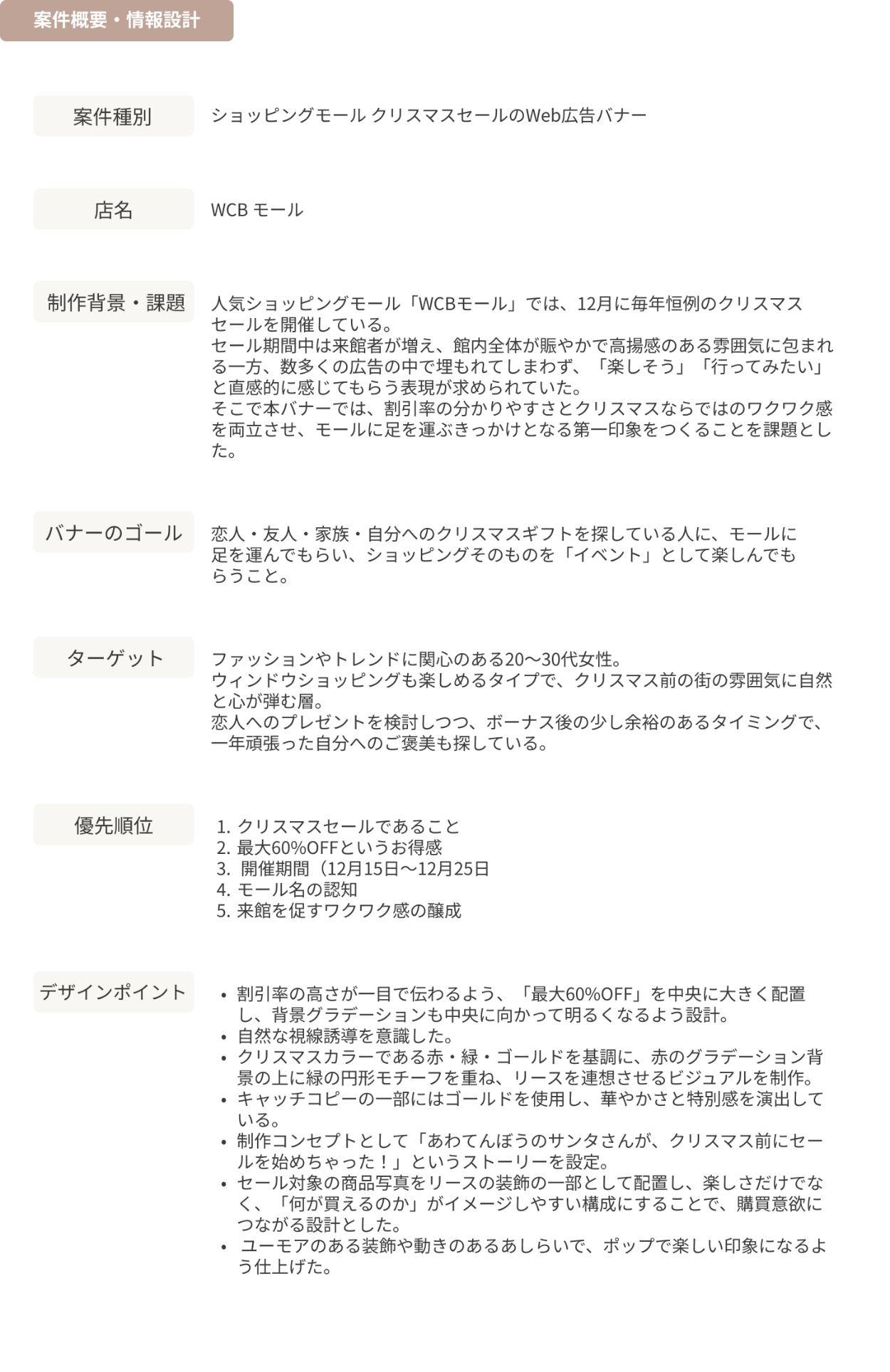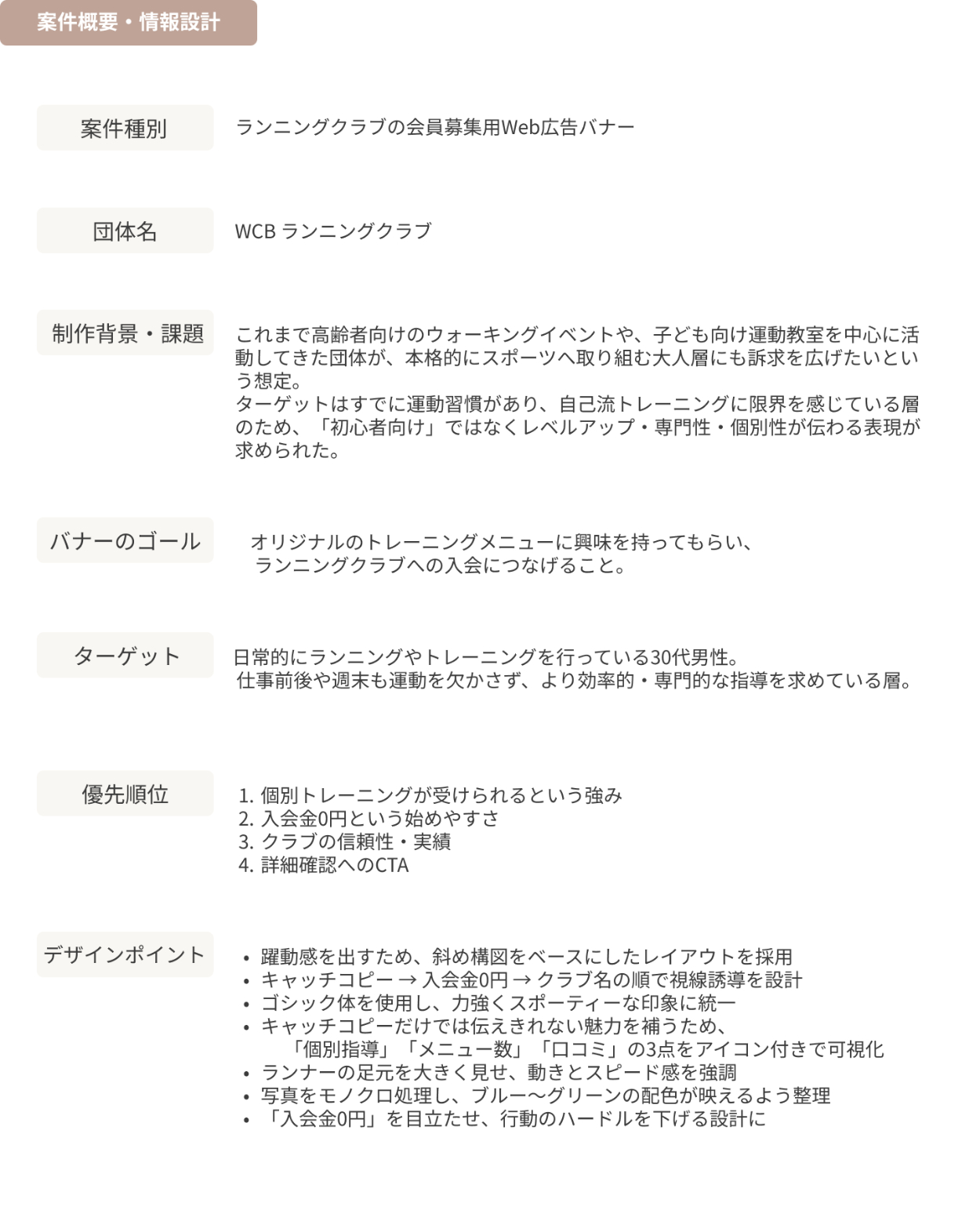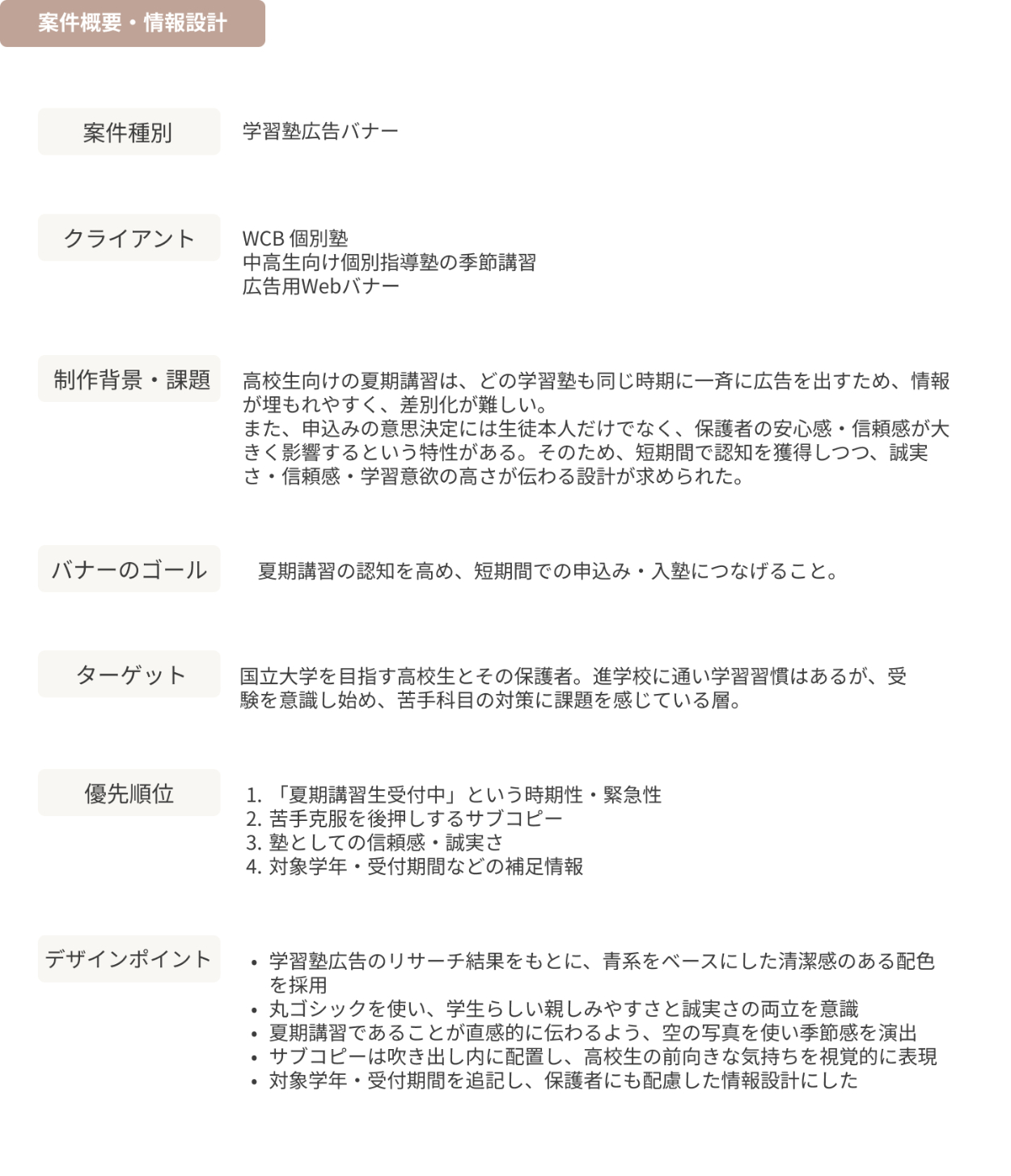 Web広告における成果を意識し、業種・ターゲット・広告の目的をそれぞれ設定した上で バナー制作を10件行いました。「感情喚起 → 情報理解 → 行動」の流れを意識し、情報設計と言語化を重視して制作しています。(制作期間 | 2025年 3月 - 5月)