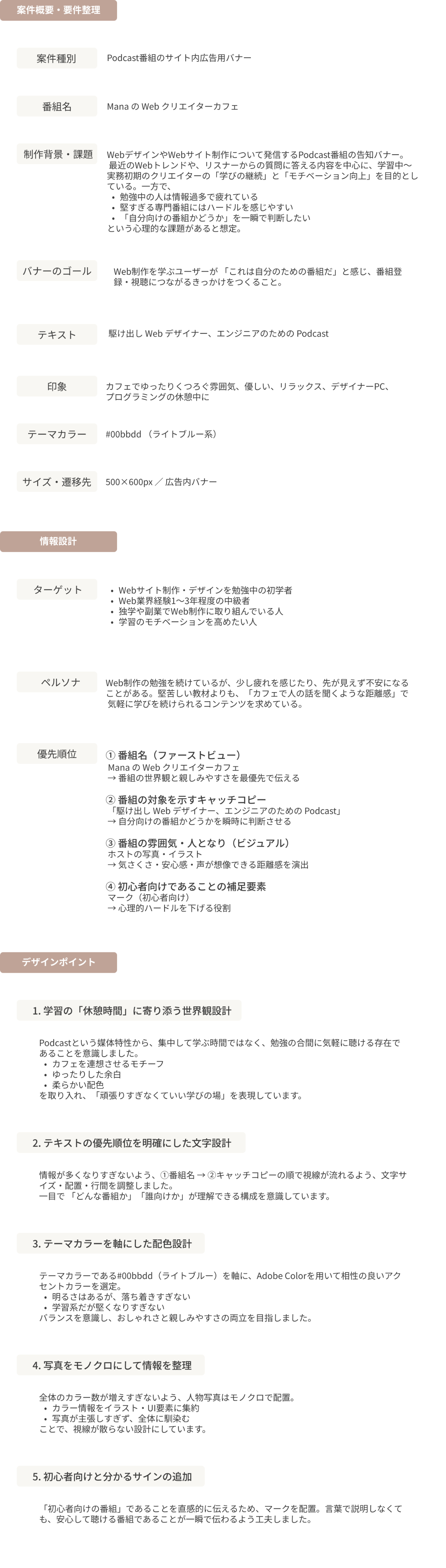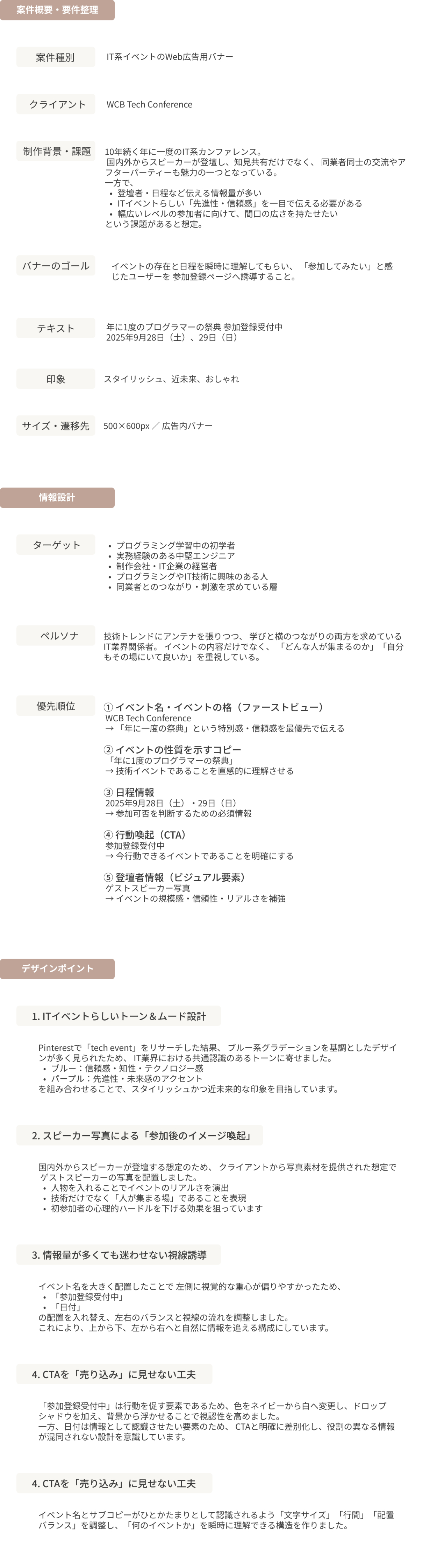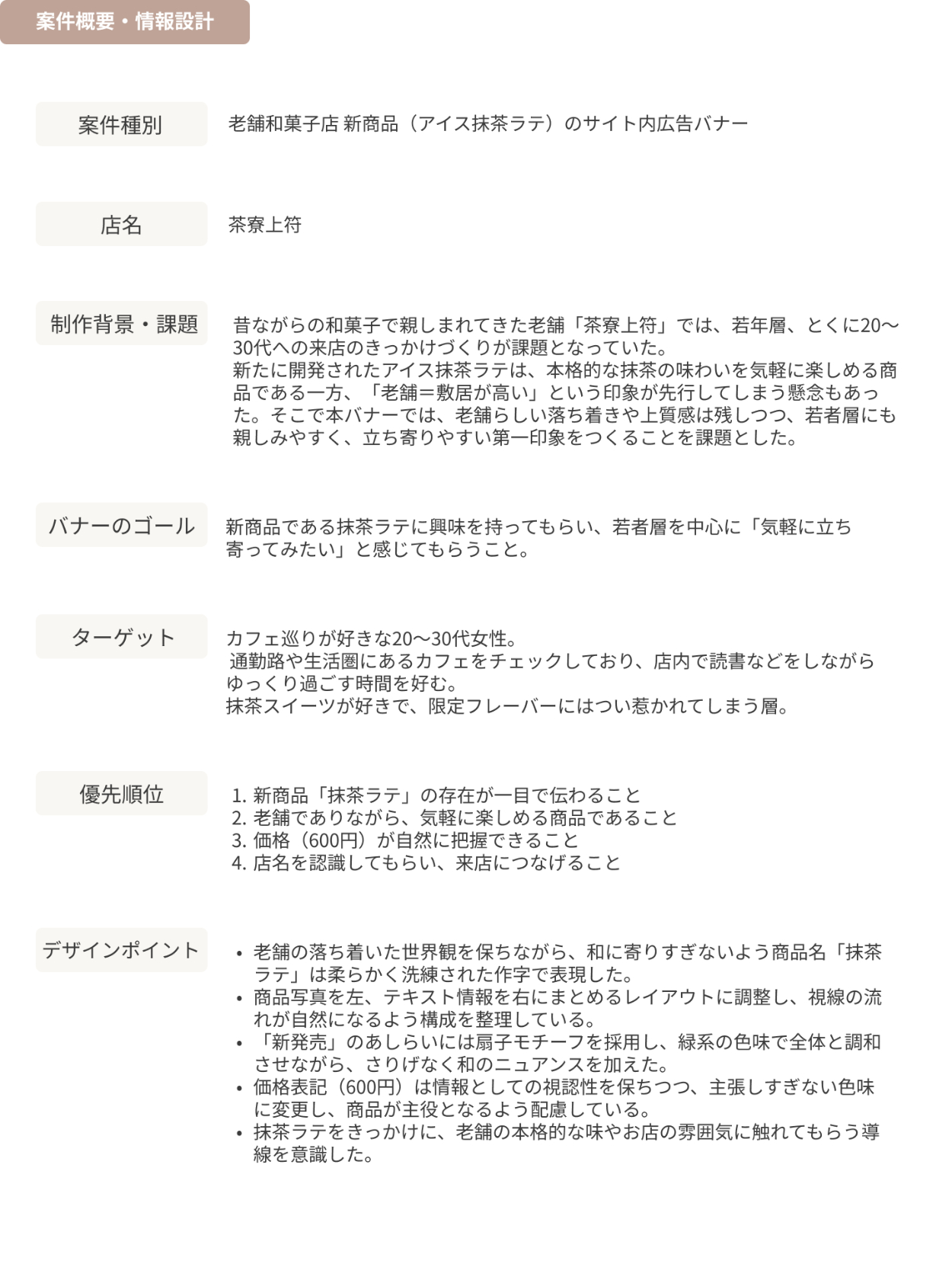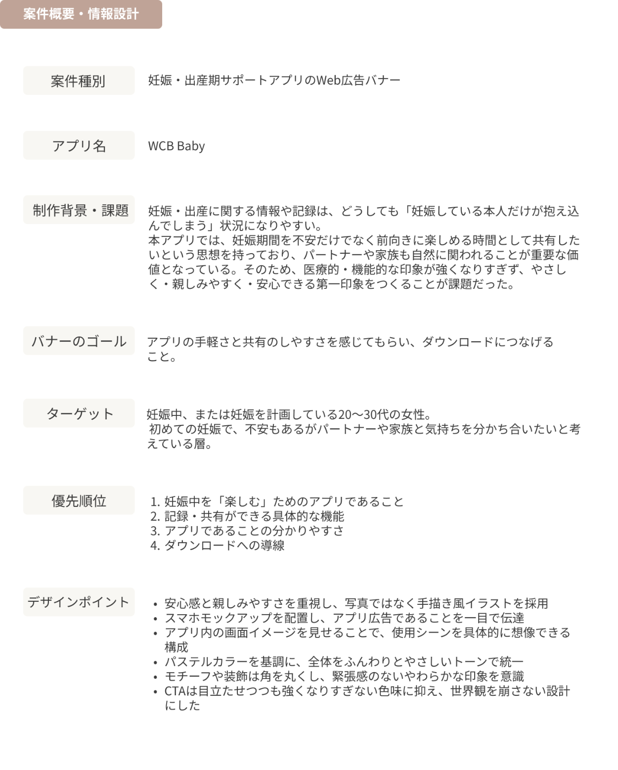 Web広告における成果を意識し、業種・ターゲット・広告の目的をそれぞれ設定した上で バナー制作を10件行いました。「感情喚起 → 情報理解 → 行動」の流れを意識し、情報設計と言語化を重視して制作しています。(制作期間 | 2025年 3月 - 5月)