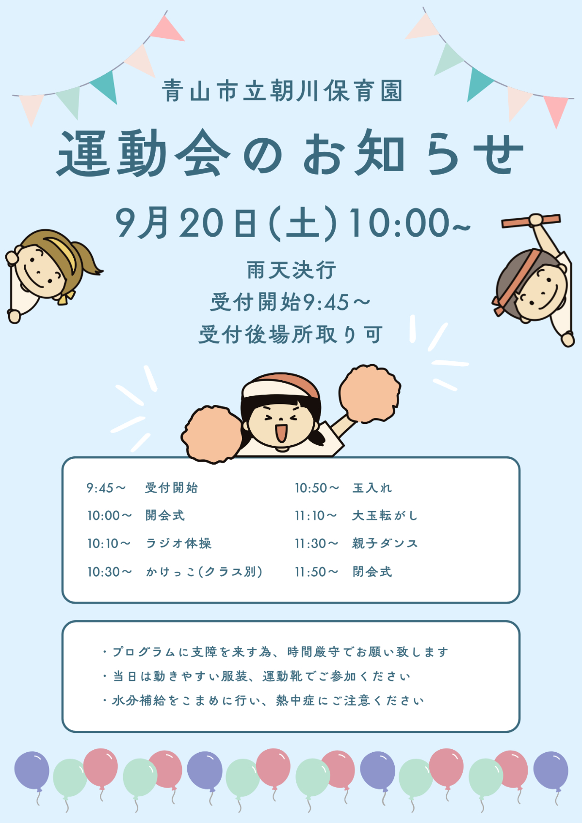 チラシ A4縦(架空案件) Nacobo フリーランス cad、web、グラフィック、イラスト OVERVIEW チラシ A4縦|運動会のお知らせ(架空案件) サイズ:A4縦使用ツール:Canva作成時間:2時間・ターゲット園児の保護者・作成ポイントタイトルのフォントサイズを大きく、プログラム内容や注意事項は小さく、上から下へ読みやすくした。
