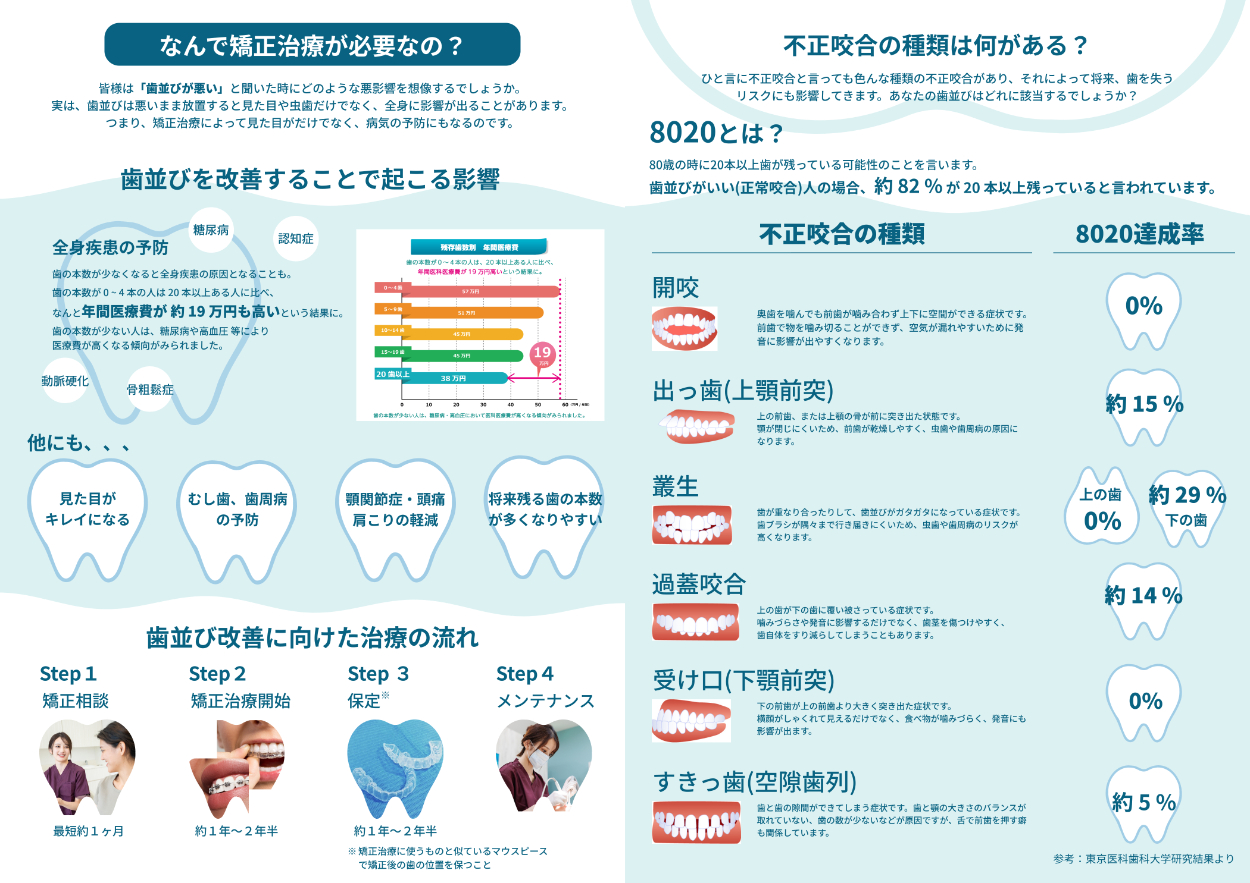 【パンフレット】矯正治療に関するパンフレット mototsugu Webデザイナー OVERVIEW 医療関係者様からご依頼をいただき、パンフレット制作を実施した。 見開きも意識して配置、文字組みなど理解しやすさを追求した。 YEAR 2023