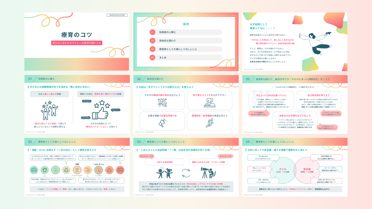 児童発達支援/放課後等デイサービスの事業所で行う研修を依頼され、その際に使用する研修用のスライドを作成しました。当日は研修用の資料として使用しました。