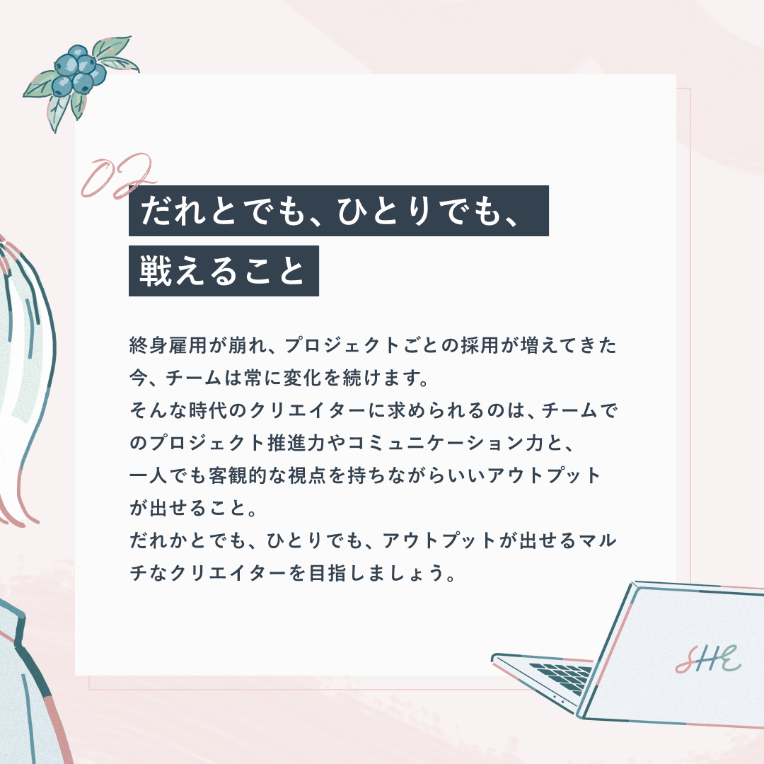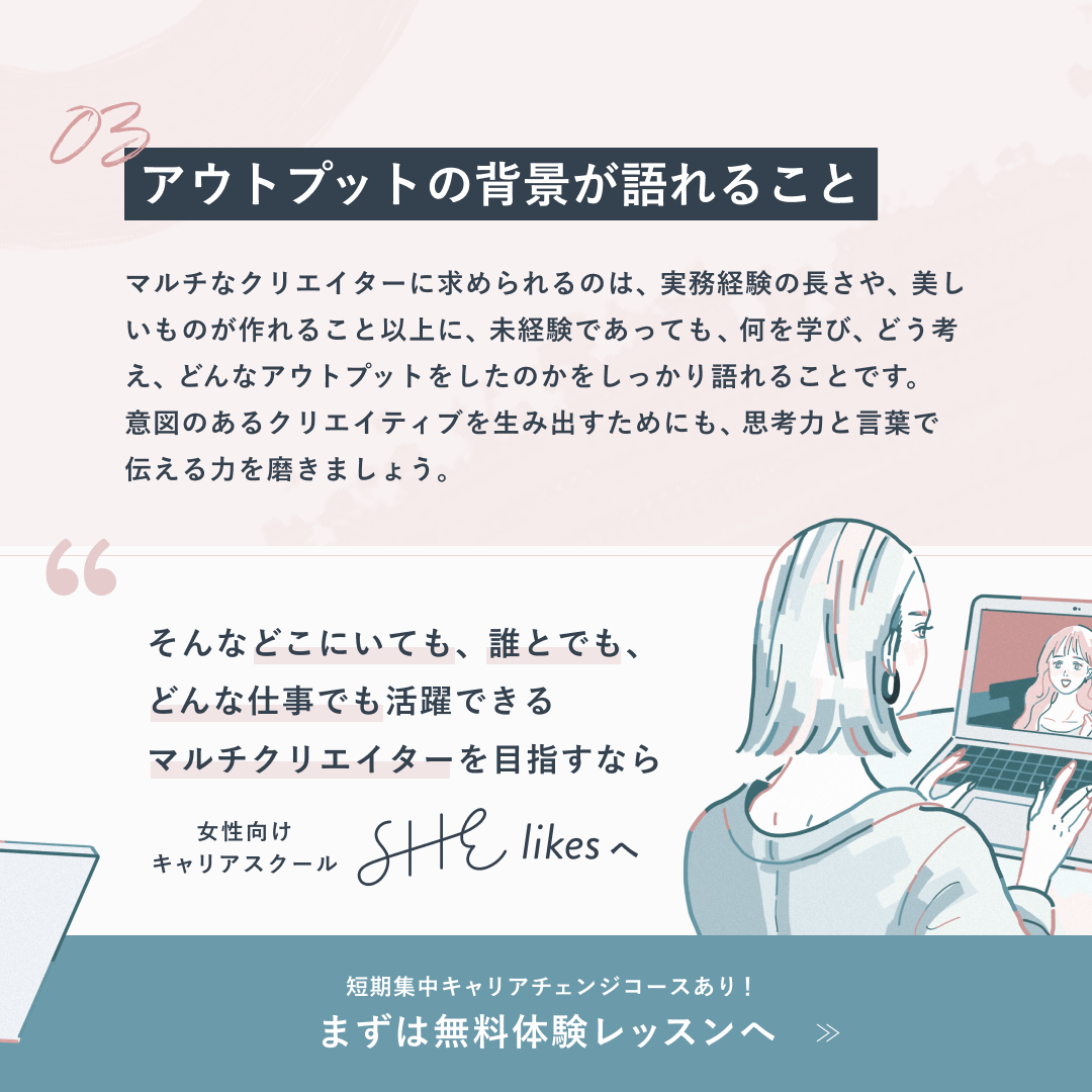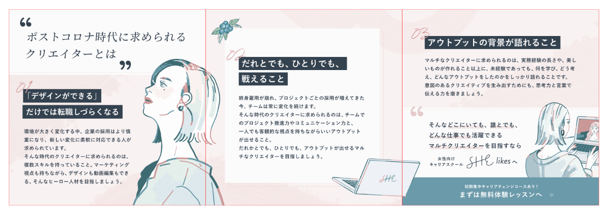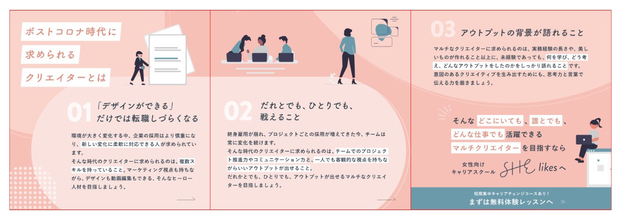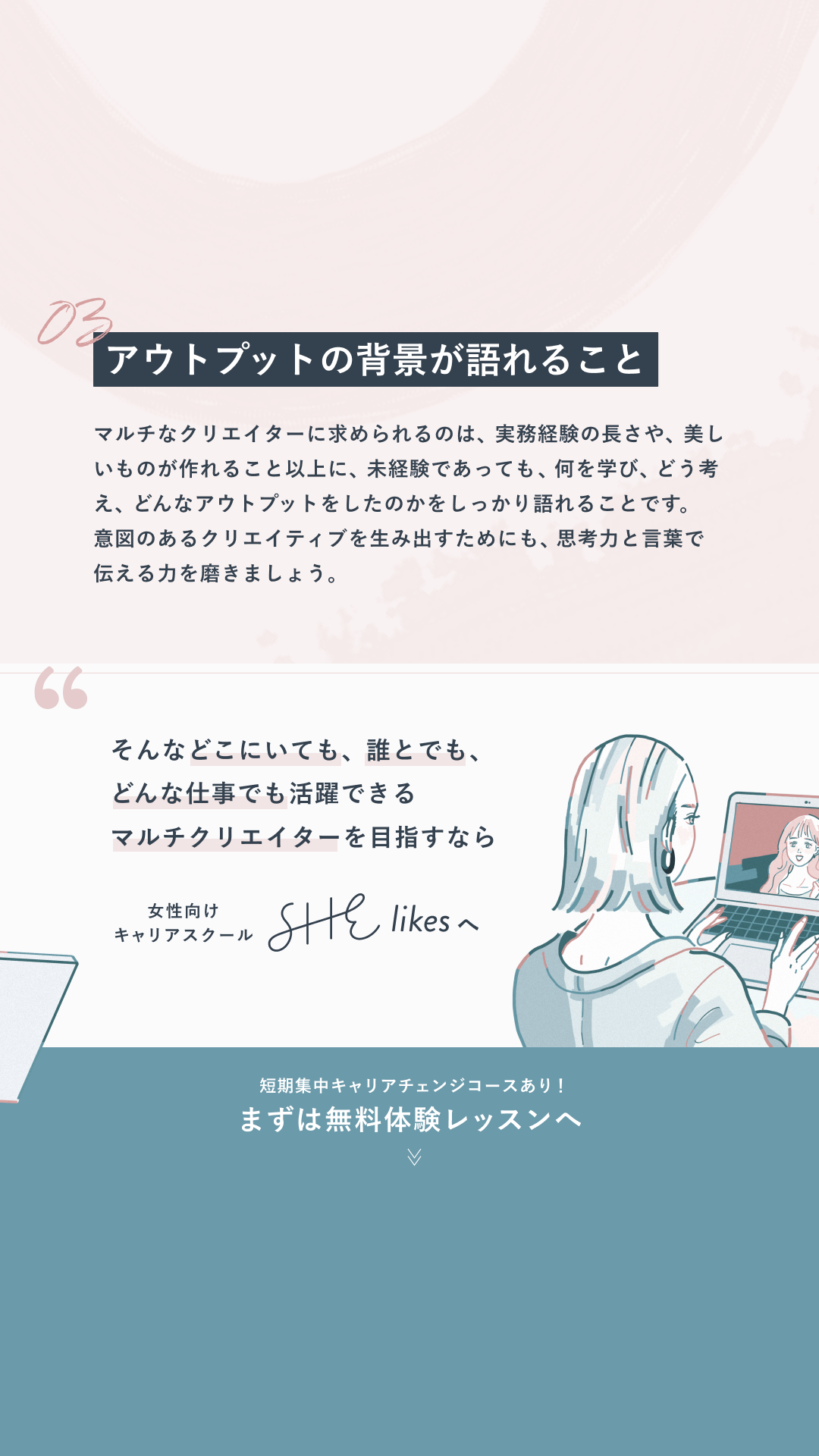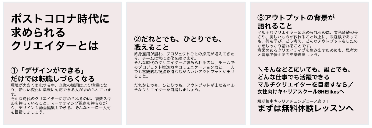 SHE株式会社様が運営する女性向けキャリアスクール「SHElikes」体験レッスンへの誘導を目的とした広告バナーを制作しました。 作成:カルーセル3枚×2サイズ/使用ツール:Figma/制作時間:約3時間