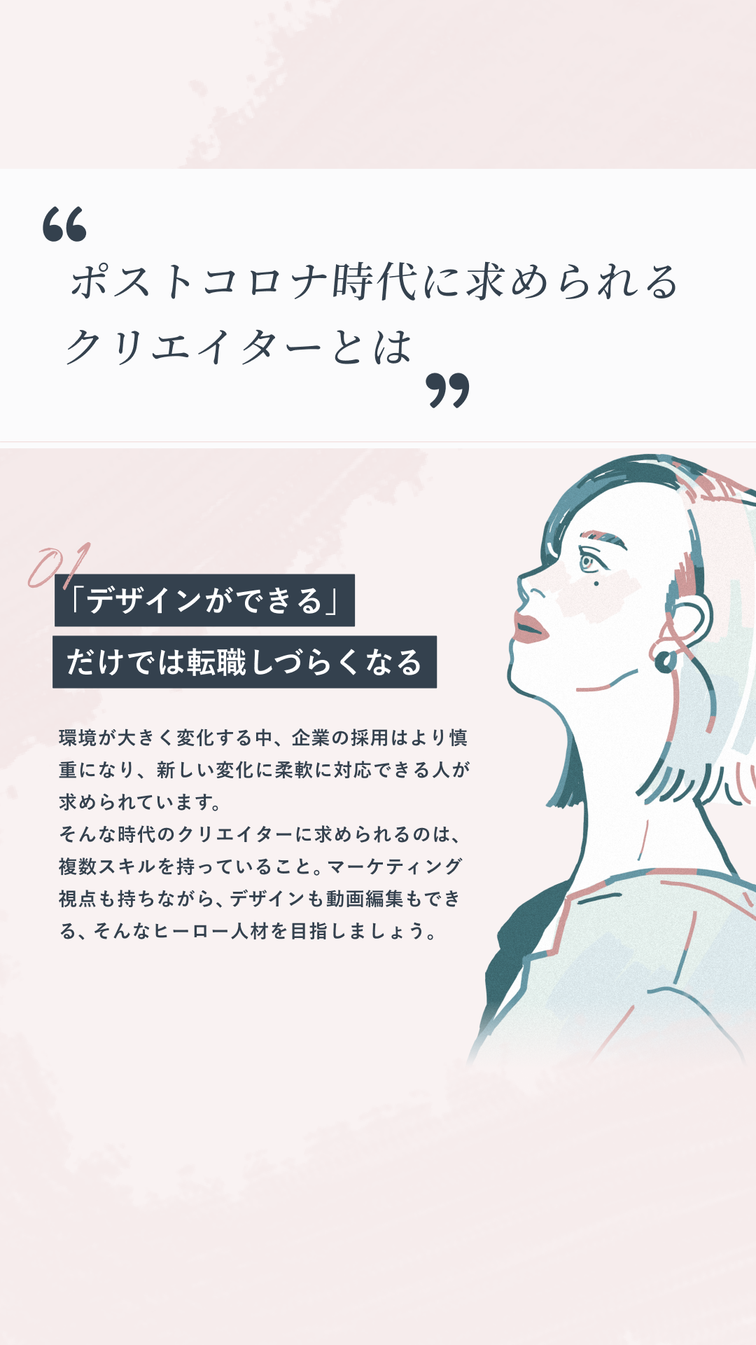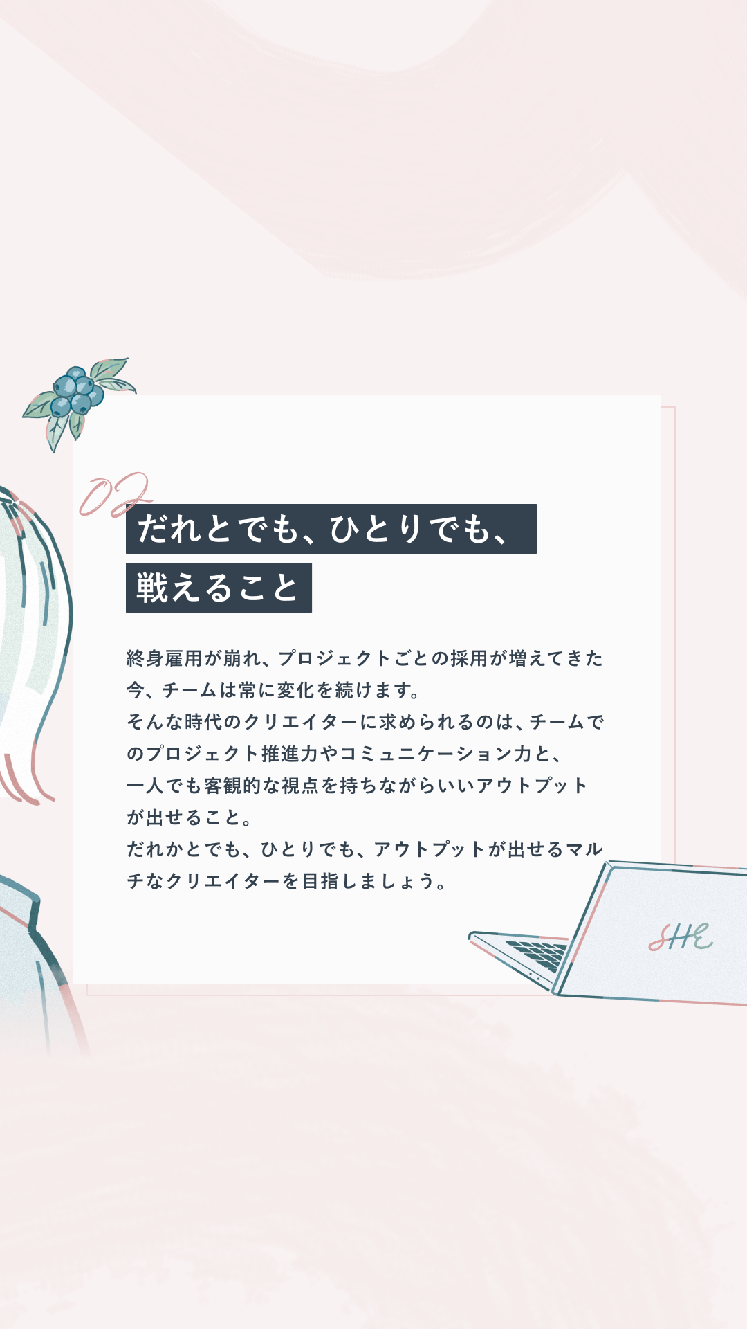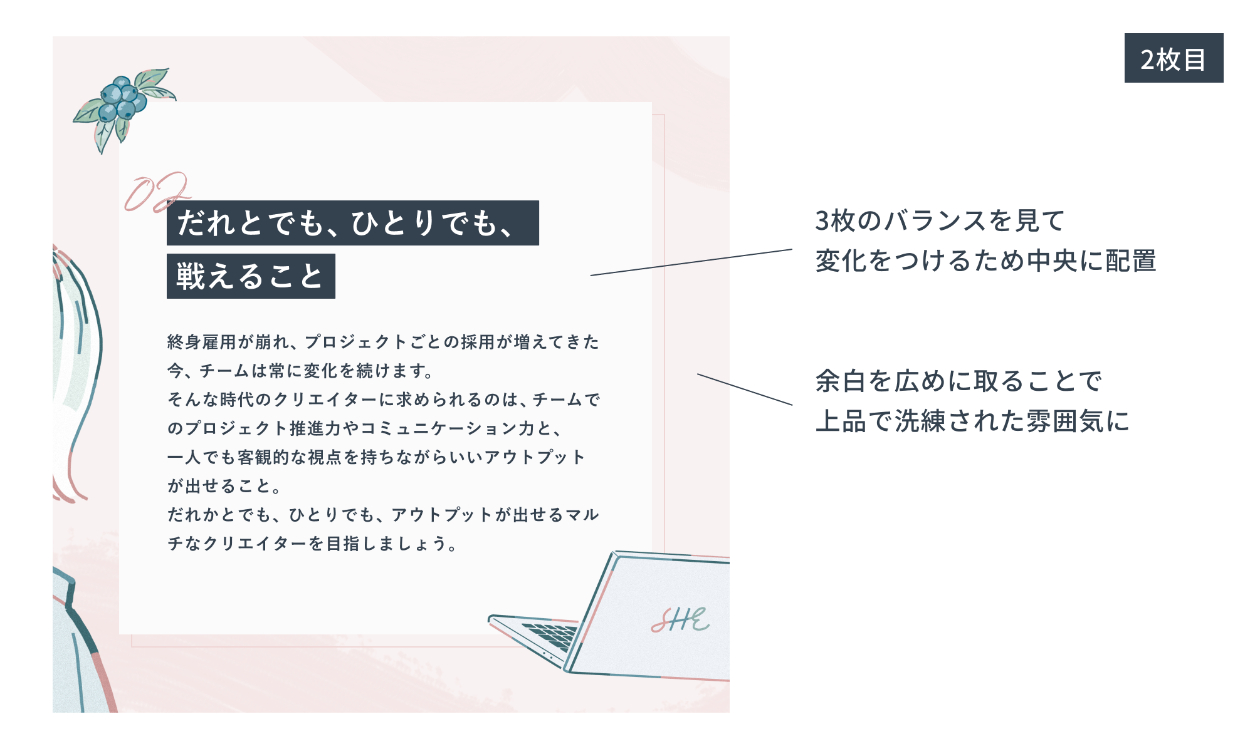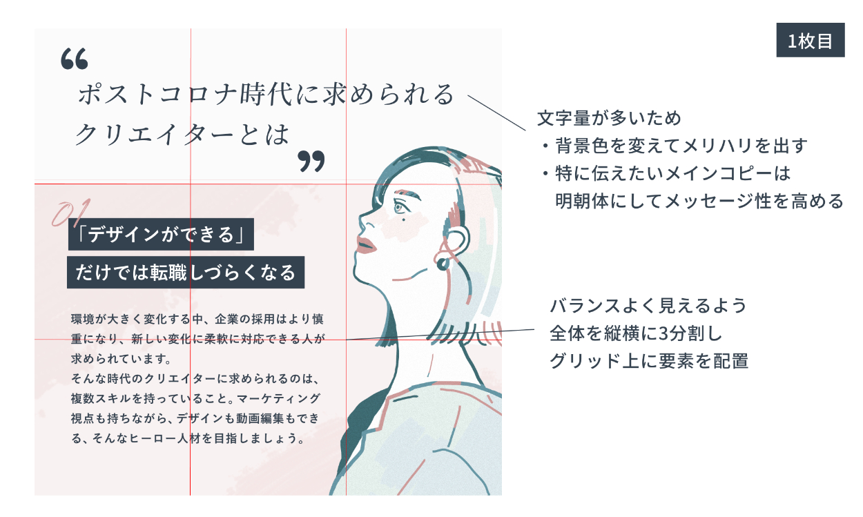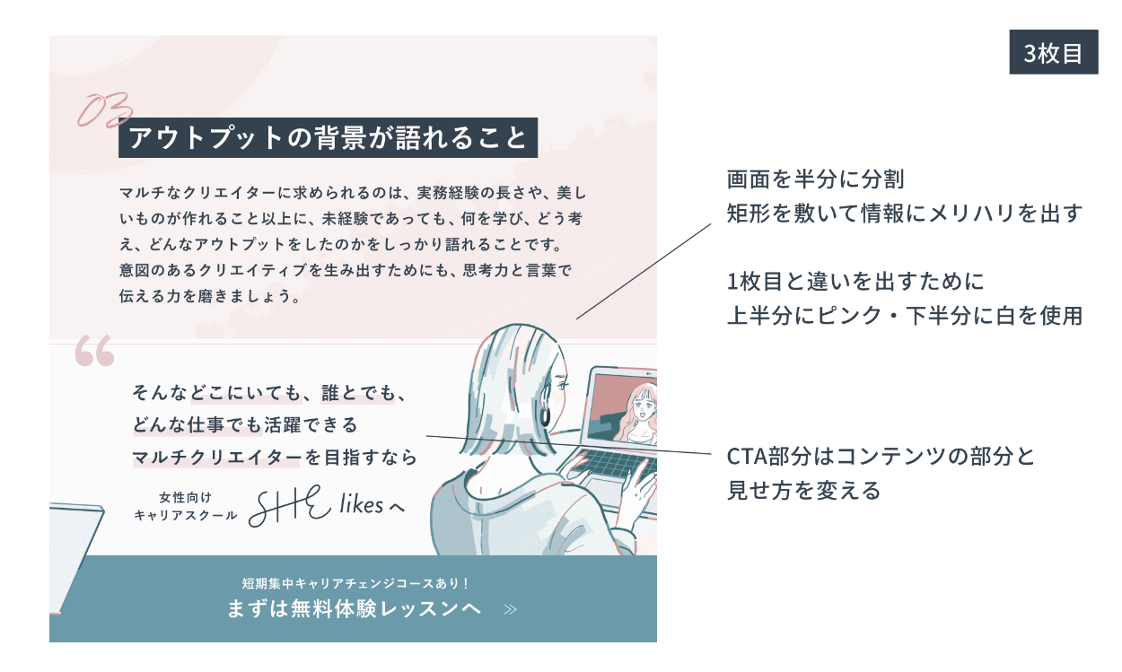 カルーセルでは最後まで読ませることが重要だと考え、あえてイラストを見切れさせて次のページに繋がっているようにレイアウトすることで「次のページにスワイプしたくなる」デザインにしました。