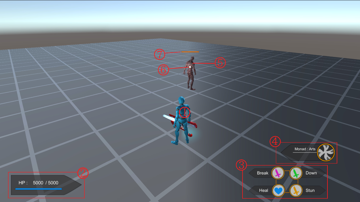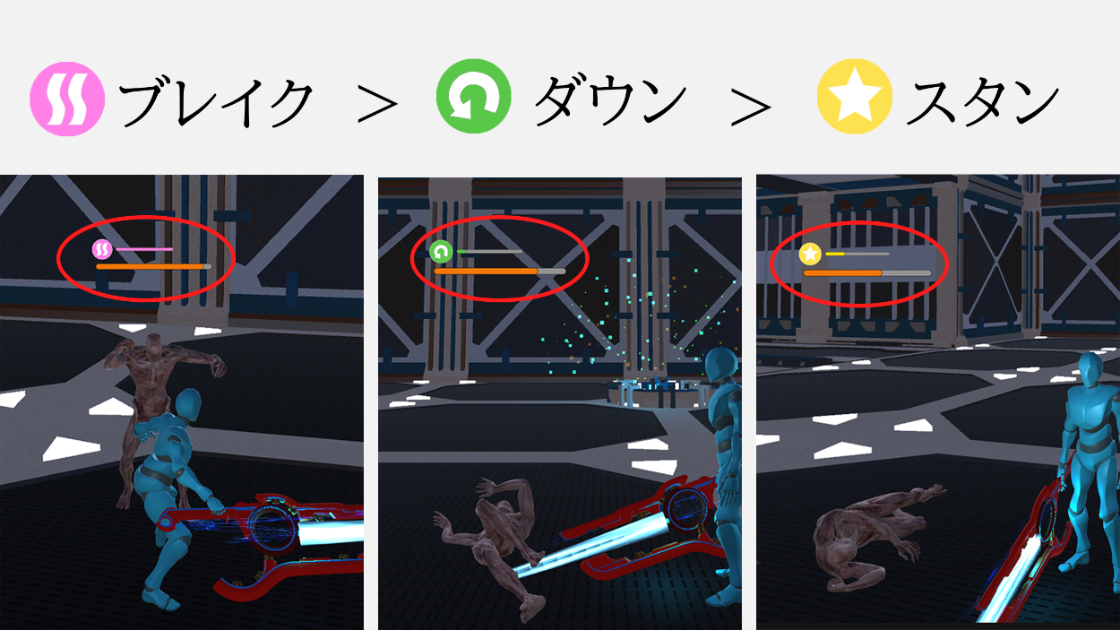原作のゼノブレイドでは、様々な効果のアーツがある。それらをブレイク効果のアーツ>ダウン効果のアーツ>スタン効果のアーツの順番でヒットさせるとがコンボが繋ります。ゼノブレイドの戦闘の醍醐味の1つでもあるので、それを再現してみた。この制作ではブレイク状態の敵は使用する技の種類が減り、ダウンとスタン状態の敵には与えるダメージが増加するシステムにしてみた。アイコンの見た目は丸パクリだが、一応は自分でイラストを描いたものを使っている。