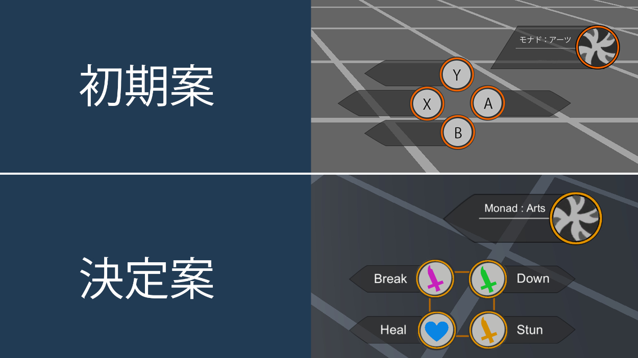 初期の方は、ゼノブレイド3を参考にして配置しています。原作だとAボタンのアーツはタレントアーツと言う通常のアーツとは別のものになっているのに対して、私が自作したこのゲームではA,B,X,Yのすべてを通常のアーツにしています。どのアーツも重要度は同じくらいなのにAボタンだけアーツ名を書く位置が違うのに違和感を感じたので、決定案の様に整列させました。整列させた事で、ボタンを直感的に押し辛くなってしまった気はしますが、初期案よりは良くなったと思っています。