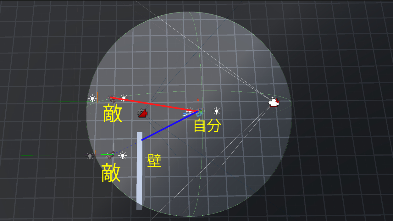 上図の明るい部分がプレイヤーの索敵範囲で、スフィアコライダーで設定しています。しかし、それだけだと壁の裏の敵が見えてなくても発見できてしまう。なのでコライダーの範囲内の敵に向かってレイキャストを飛ばし、図の赤線の様にヒットした場合にロックオンできるようにしました。青線のように壁にヒットしたら、敵を視認できないと判断してロックオンできません。しかし、プレイヤーが位置を変えることで壁裏の敵を見つけた時は、ロックオンできる対象に切り替わります。カメラが敵を中心に捉えるのにはCinemachineVirtualCameraのインスペクターにあるLookAtに敵を入れてやっています。