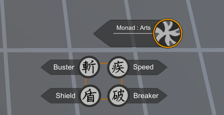 - ZRボタンを押している間はアーツの表示がモナドアーツへと切り替わる。