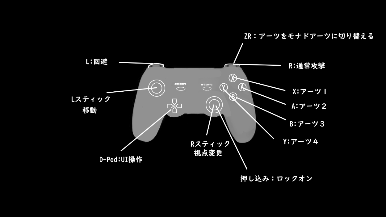 ゼノブレイド2以降のシリーズでA,B,X,Yでアーツを使うのですが、使いやすいと感じたので今回はそれに倣って設定した。スティックの操作とRはソウルライクを意識して機能を設定した。