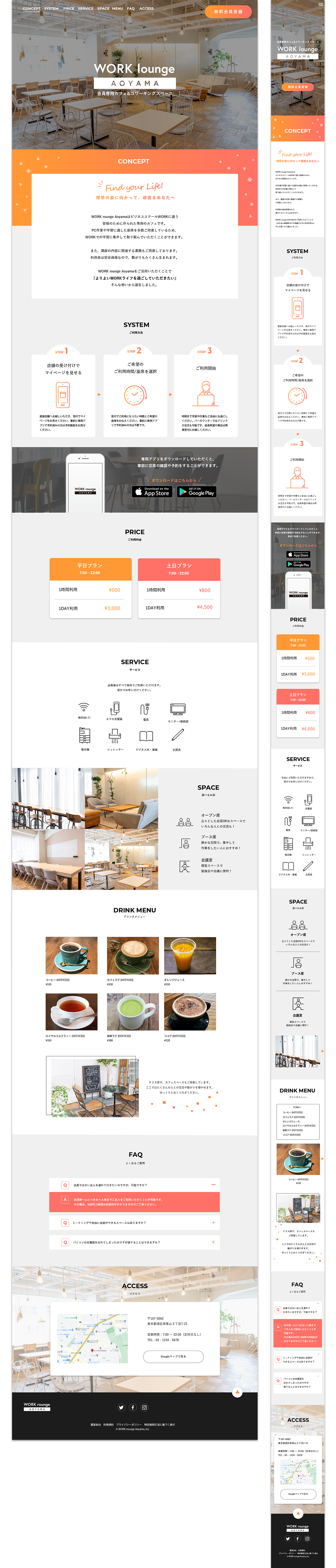 【課題】LP制作(ワイヤーフレーム・デザイン) 阿部さやか OVERVIEW SHElikes MULTI CREATOR COURSEの課題で架空のコワーキングスペース・カフェのLP制作課題に取り組みました。 使用ツール:Photoshop 制作期間:2週間 YEAR 2021 制作物概要について