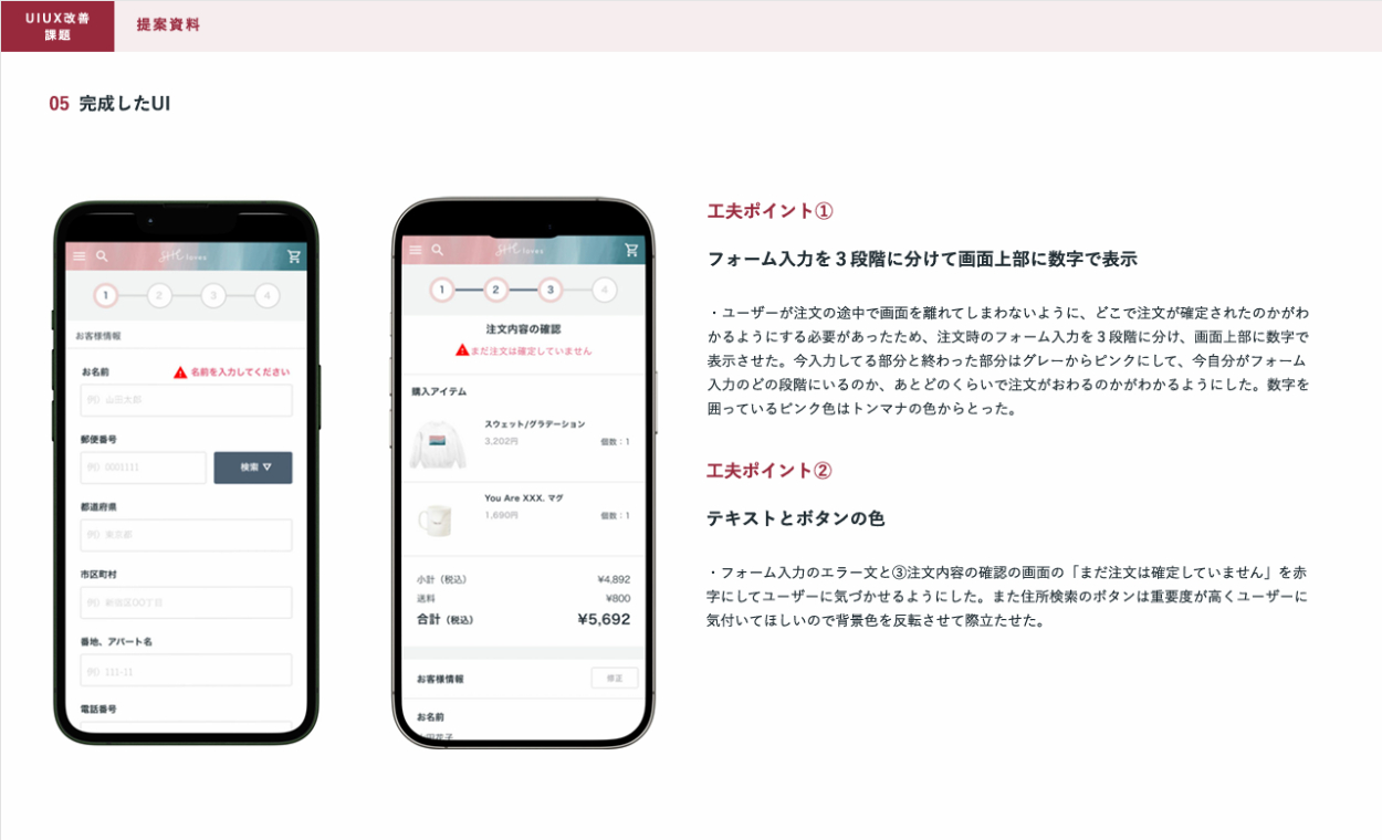 ●UIUXの課題を通して、一見普通のWEBサイト・ECサイトに見えても、「ここにボタンが一個ないだけで不便だな」とか、「フォーム入力時にプレースホルダーがないだけで自分の入力してる内容が合ってるか不安になるな」などと感じて、普段使っている通販サイトやECサイトが使うユーザーの利便性や快適性をすごく考えて作られていることを発見した。