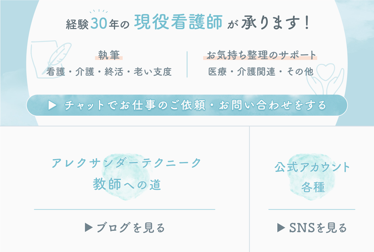 30年の看護師経験を活かし、医療や看護関連のお気持ちサポートや執筆を行なっている。またアレクサンダーテクニークを精力的に学び、身体の使い方についてやアレクサンダーテクニークの講師になるまでをブログで発信している。