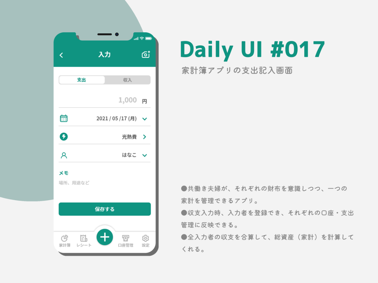 共働き夫婦が、それぞれの財布を意識しながら一つの家計を管理できるアプリをイメージしています。そのため、支出記入画面には「入力者」を設定できる欄を加えています。