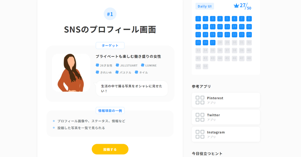 その中の「Daily UI」は、1日1画面制作できるお題を、50日分提案してくれるサービスです。