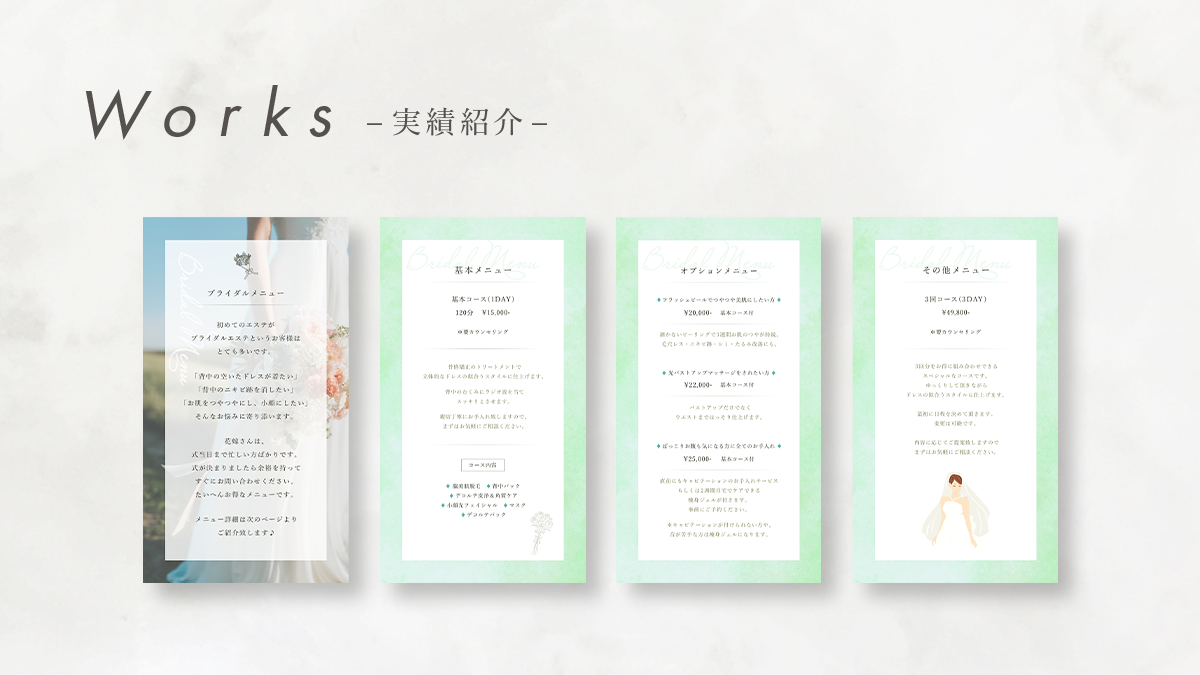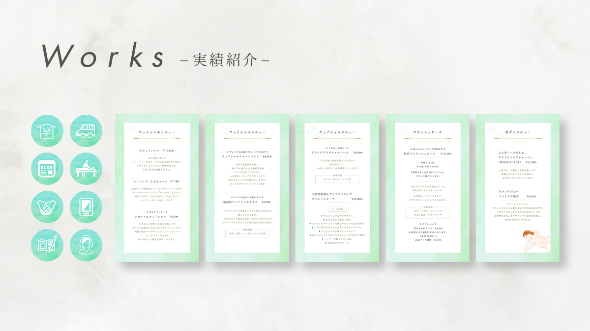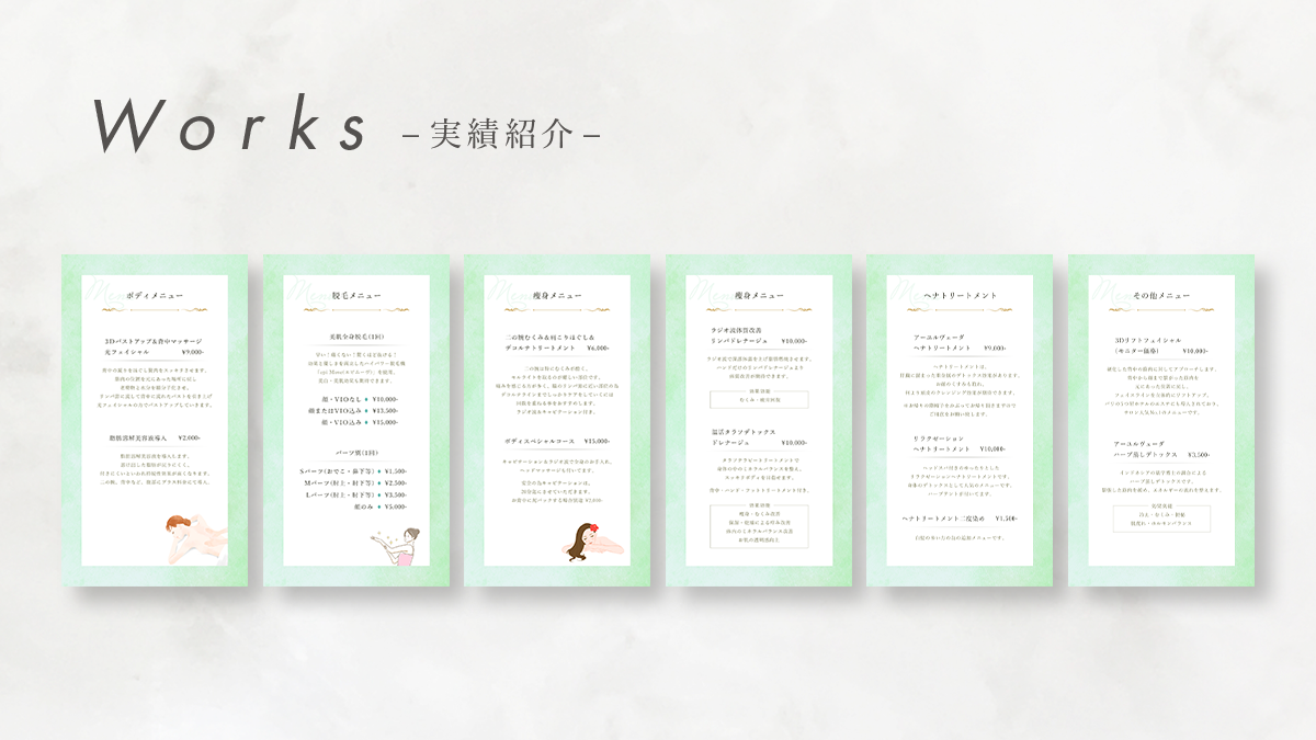 - 女性専用プライベートサロンの上品な雰囲気を演出する為、テキストは繊細な女性らしいイメージの明朝体をメインに使用しました。